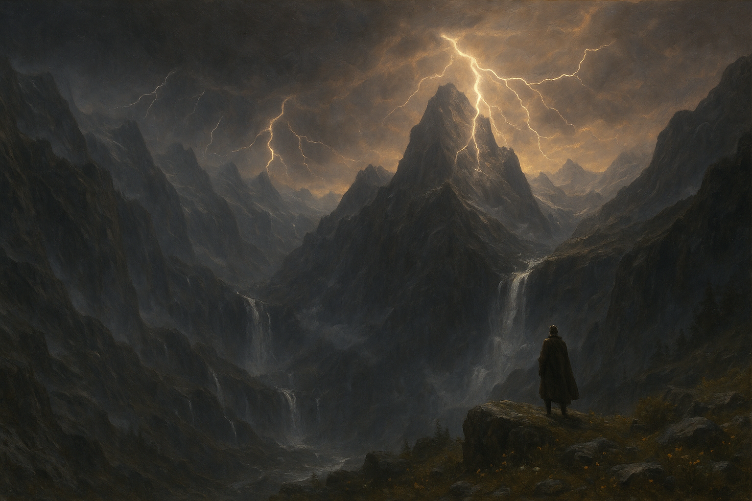 Die Donnernden Gipfel bestehen aus hoch aufragenden, scharfkantigen Bergen, deren Grate wie gezackte Kronen in den Himmel ragen. Die Gebirgskette erstreckt sich von der wilden Küste im Süden bis an die sanften Grenzen des Moosgrünen Tals und ist von tiefen Schluchten und engen Pässen durchzogen. Zahlreiche Wasserfälle stürzen mit unaufhaltsamer Kraft die Felswände hinab und speisen die Flüsse, die das Tal und die angrenzenden Regionen versorgen. Der Boden ist rau und steinig, durchsetzt von schmalen Pfaden, die nur von den Mutigsten begangen werden können. Einige Gipfel sind ständig in dichte Wolken gehüllt, während andere hoch genug ragen, um die Sonne durch die brodelnden Gewitterwolken hindurchscheinen zu lassen.