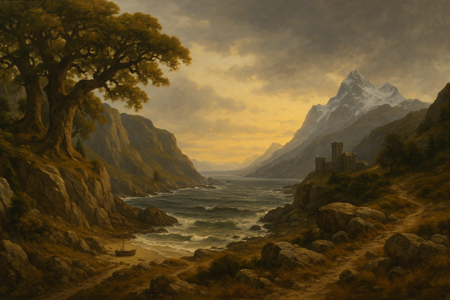 Eikelund ist eine Region, die von der unerschütterlichen Kraft der Natur und den uralten Wurzeln der Geschichte geformt wurde. Gewaltige Steilküsten prägen die Küstenlinie, und an ihren Klippen ragen die Wächtereichen, deren gewaltige Wurzeln tief in die Felsen greifen und die raue Seeluft trotzen. Zwischen den Klippen schmiegen sich verborgene Buchten, die sich sowohl als sichere Häfen als auch als mystische Rückzugsorte für Reisende anbieten. Weiter im Landesinneren breiten sich die Schildhaine aus – dichte, majestätische Wälder, in denen Eichen seit Jahrtausenden stehen und als spirituelle Hüter der Region verehrt werden. Hinter den Wäldern erhebt sich das Eikelund-Gebirge, dessen schneebedeckte Gipfel wie titanische Wächter über das Land wachen und durch natürliche Pässe Zugang zu den benachbarten Tälern gewähren. In den fruchtbaren Gebirgstälern, gespeist von klaren Flüssen, liegen kleine Dörfer, deren Bewohner die Kraft der Natur als Verbündeten betrachten. Am Übergang zwischen Wald und Berg stehen die Schildfeste, mächtige Festungen aus Stein und Holz, die die Stärke der Eikelunder symbolisieren und den Schutz der Ahnenwächter ehren. Eikelund ist mehr als eine Landschaft – es ist ein Reich der Wildnis, der Legenden und der uralten Bäume, deren tiefes Flüstern von Zeiten spricht, die niemand mehr erinnert.