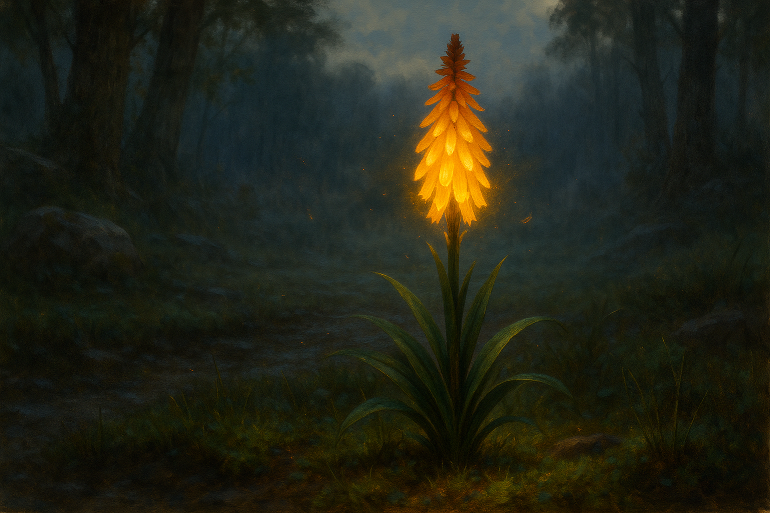 Die Blüten der Fackellilie sind röhrenförmig und leuchten in einem intensiven Goldton, der bei Nacht ein sanftes Glühen entfaltet. Sie verströmen einen süßlichen, warmen Duft, der Motten und andere magische Wesen anlockt. In kühlen Nächten kann ihr Licht ihre Umgebung leicht erwärmen, weshalb sie oft als natürliches Zeichen für den Frühlingsbeginn gesehen wird. Ihre Blütenblätter sind zart, aber widerstandsfähig gegen Wind und Wetter. Nach wenigen Tagen beginnt das Leuchten zu verblassen, und die Blüte schließt sich, bis sie im nächsten Jahr erneut erstrahlt.