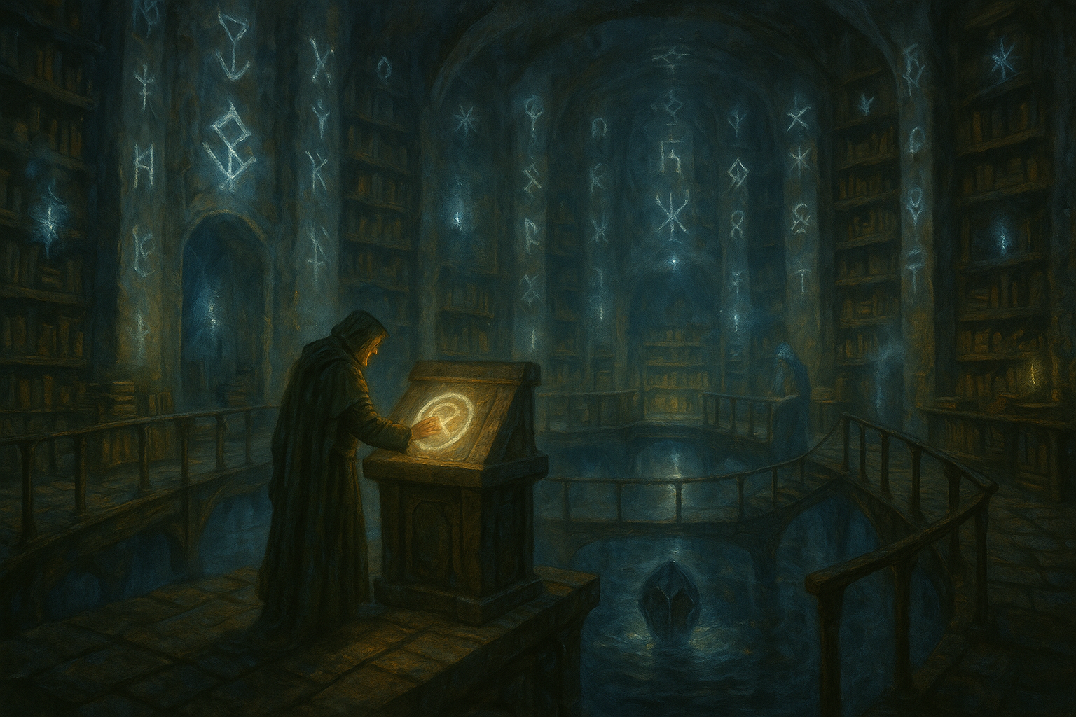 Eine gewaltige Kammer aus Basalt und Bronze. Schwebezeichen aus Licht bewahren Verträge und Bannlisten vergangener Jahrhunderte. Nur die Flüsterer und ihre Schüler dürfen hier lesen.