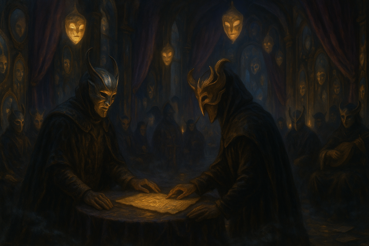 Ein Ort der Täuschung, wo alle mit Masken verhandeln. Wahrheit und Lüge verlieren hier ihre Bedeutung. Die Masken selbst sind magisch und verändern Stimme, Haltung und Gesicht.