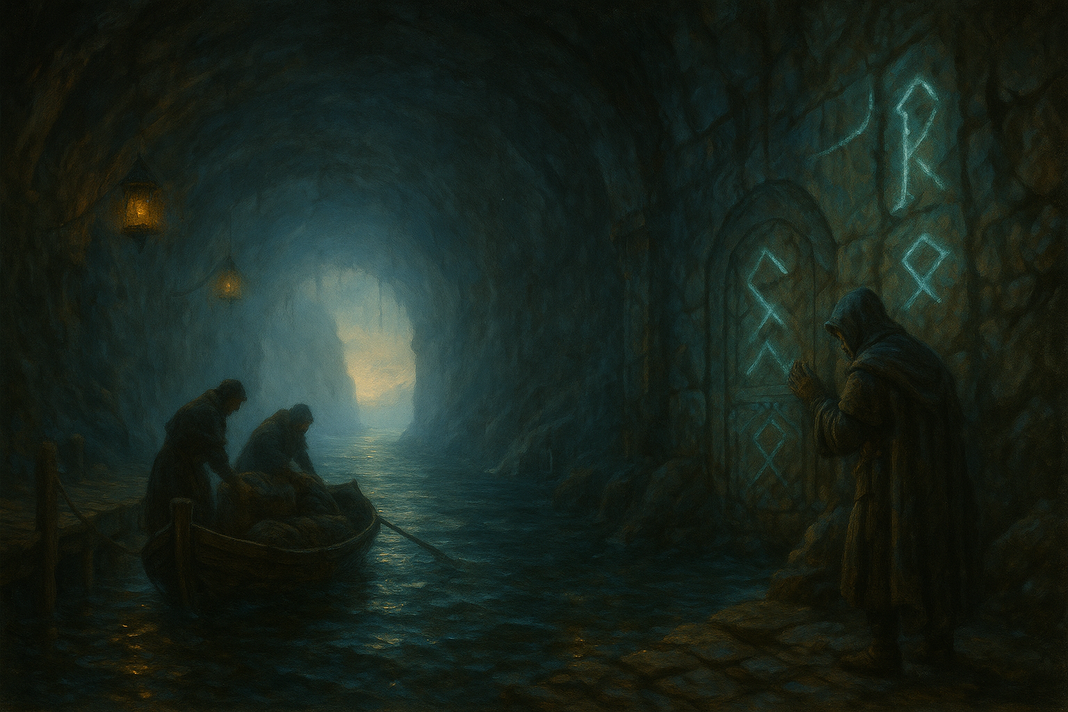 Ein schmaler, von Runen bewachter Tunnel, der direkt ins offene Meer führt. Kleine Schiffe gleiten durch die Dunkelheit hinaus. Das Tor öffnet sich nur auf bestimmte Worte – Worte, die sich niemand zu merken wagt.