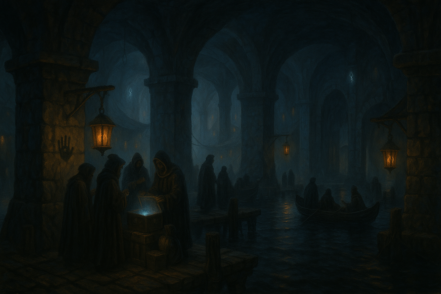 Das pulsierende Zentrum des Flüsterhafens. Ein Gewirr aus Holzstegen, schwimmenden Plattformen und Runenlaternen, deren blaues Licht die Dunkelheit in vibrierendes Schimmern taucht. Händler flüstern ihre Angebote, während Dampf, Magie und Stimmen über das schwarze Wasser wabern.