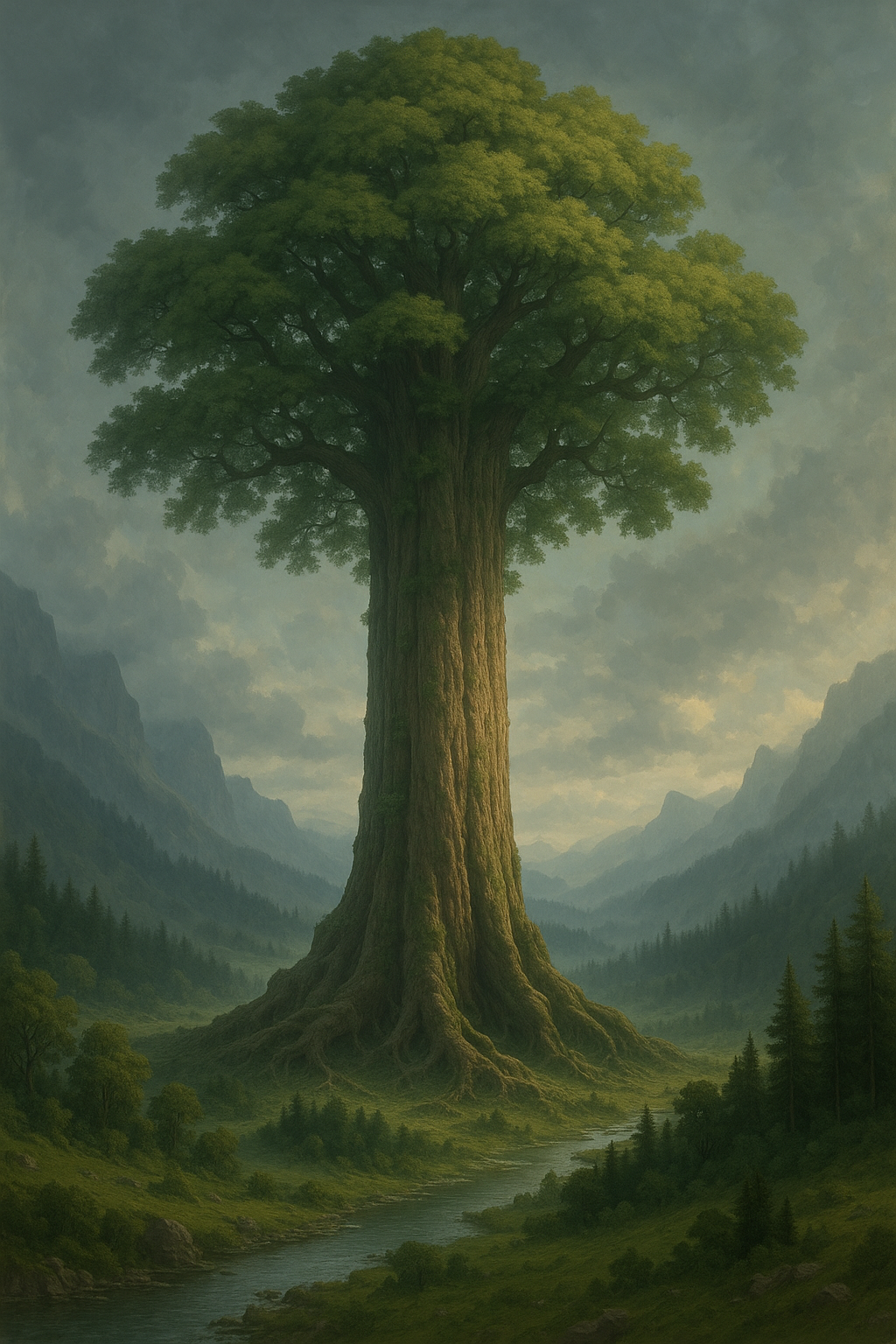Seine Wurzeln reichen bis in die Anfänge der Schöpfung hinab, wo Licht und Finsternis einander begegneten. Aus diesem Urkonflikt erwuchs er als Vermittler – nicht als Richter, sondern als lebendiger Ausdruck der Balance zwischen den Kräften. In seiner Krone trägt er das Himmelslicht, in seinen Wurzeln ruht die Tiefe der Erde, und in seiner Mitte pulsiert das Herz allen Lebens.