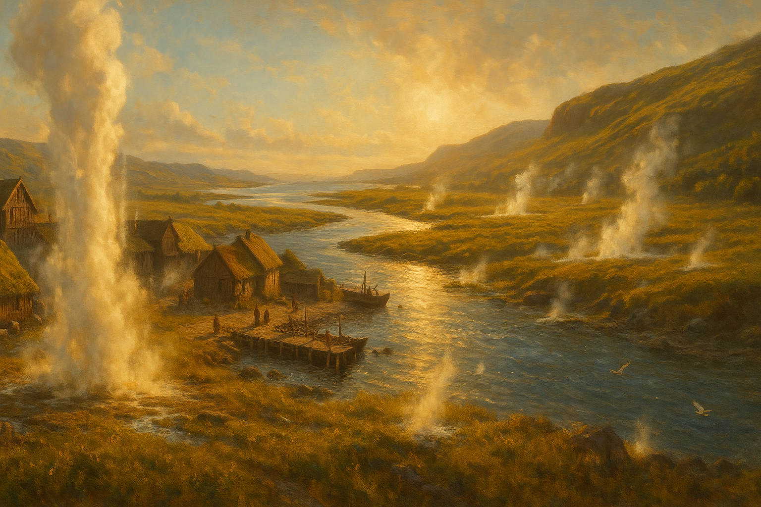 An der Küste, wo der Fluss in das Meer fließt, liegt die kleine, aber lebendige Hauptstadt Geysirholm. Diese urige Stadt besticht durch enge Gassen und restaurierte Bauwerke, die den Charme vergangener Zeiten versprühen. Geysirholm dient als kulturelles und wirtschaftliches Herz der Region, wo Händler, Reisende und Einheimische gleichermaßen den Reichtum der natürlichen Gegebenheiten zelebrieren.