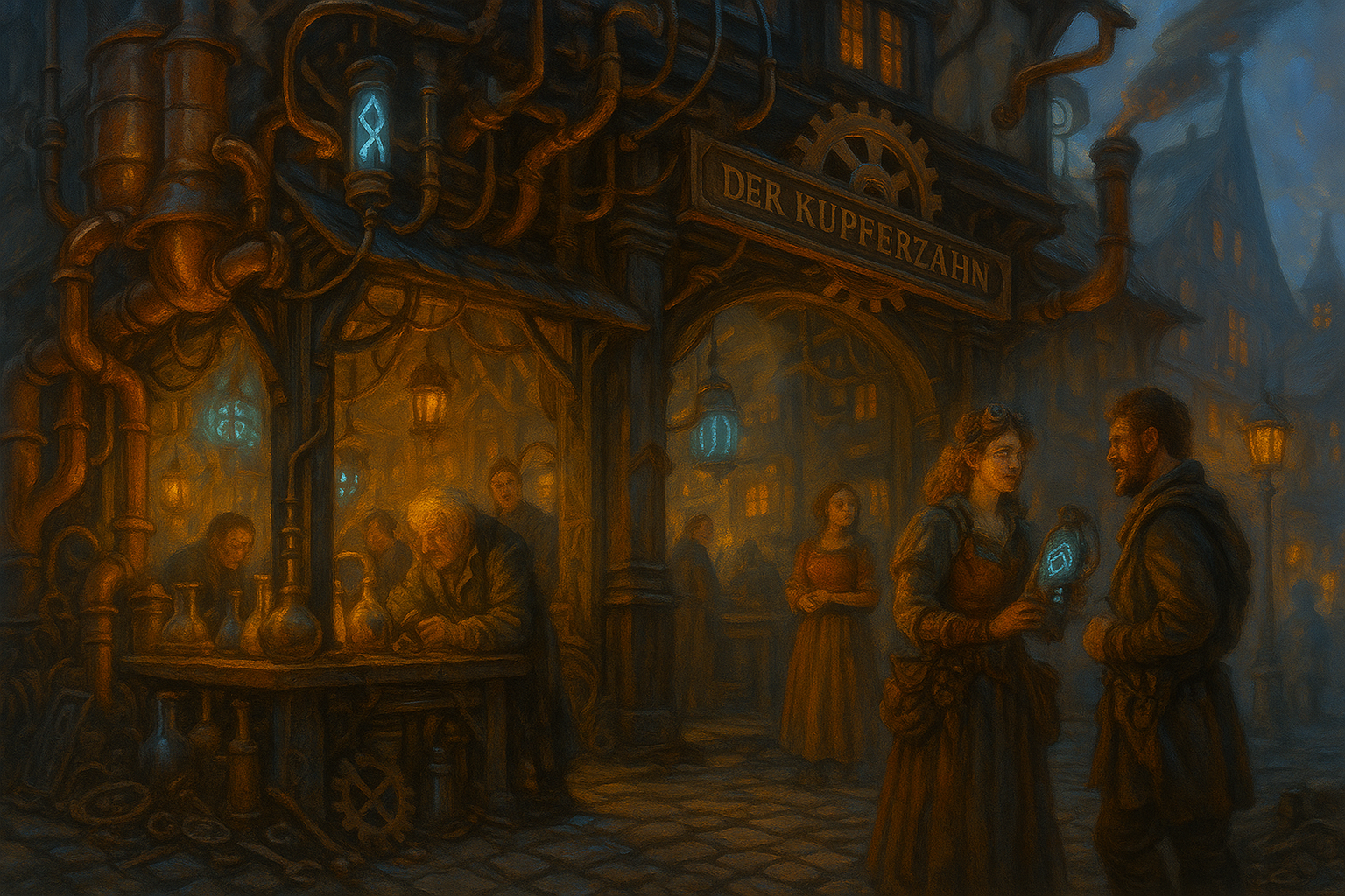 Eine skurrile Mischung aus Werkstatt und Schenke – Treffpunkt für Bastler, Runenmechaniker und Exzentriker. Zahnräder, Dampf und Magie verschmelzen hier zu einem vibrierenden, metallischen Durcheinander.