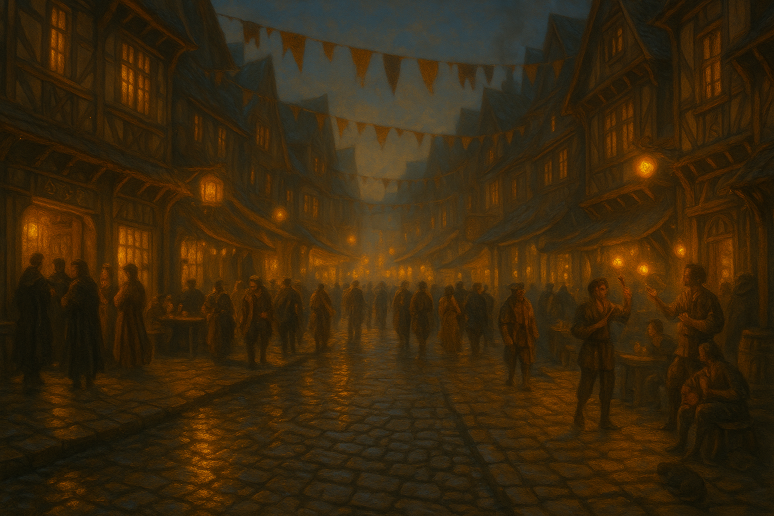 Musik, Lachen und das Klirren von Bechern hallen über das Pflaster, während Laternen in goldenen Farben flackern. Zwischen dem Duft von Gewürzwein, Rauch und salziger Brise tanzt das Leben – laut, wild, unberechenbar.