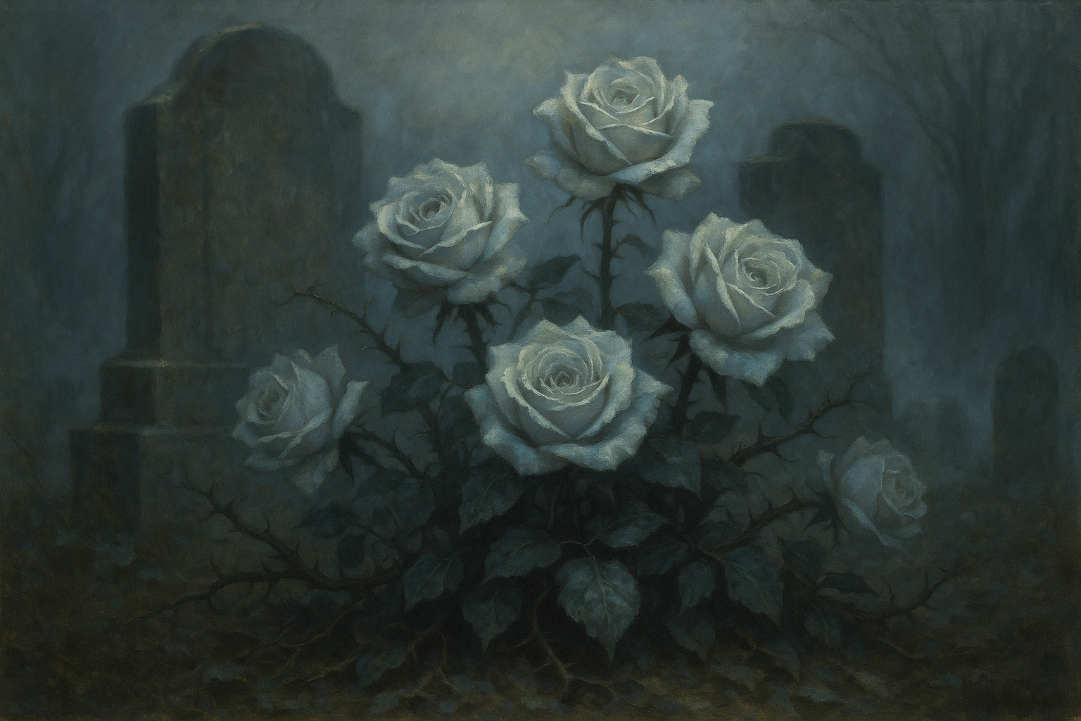 Die Grabrose ist eine geheimnisvolle und übernatürliche Pflanze, die ausschließlich an Orten gedeiht, an denen Wesen begraben wurden. Sie wächst zu imposanten Größen heran – ihre dornigen Ranken können bis zu 10 Fuß in die Höhe ragen und sich auf 30 Fuß ausbreiten. Ihre Blüten gleichen einfachen Gänseblümchen, doch die Unterseite ihrer Blätter zeigt ein seltsames Muster aus weißen und schwarzen Punkten – ein Zeichen ihrer Verbindung zur Welt der Verstorbenen. Die Dornen der Grabrose sind harmlos für die Haut, doch ihre wahre Kraft liegt verborgen: Sie nehmen Kontakt zu den Überresten auf, die unter ihnen ruhen, und lassen die Stimmen der Vergangenheit durch ihre Blätter flüstern.