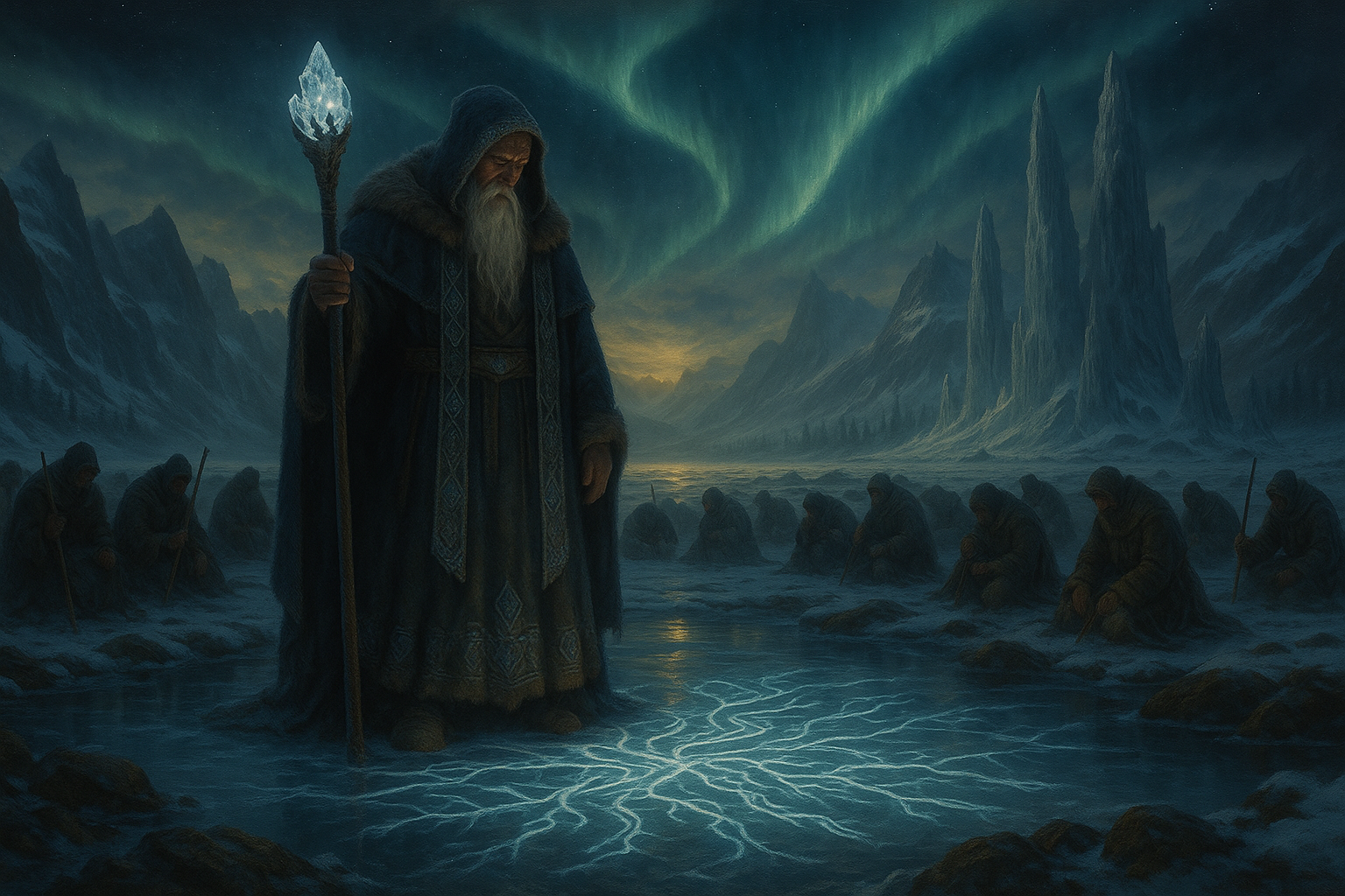 In den tiefen Wintern Frostvirs, wo das Eis niemals vollständig schmilzt und der Wind unaufhörlich durch die endlosen Ebenen fegt, gibt es einen Titel, der Ehrfurcht und spirituelle Autorität verkörpert – Guunlanii, der Führer, der das Geflecht webt. Er ist die höchste spirituelle Instanz von Lutuviima, der Religion der Nordkarlen, und trägt die Verantwortung, das Frostgeflecht zu bewahren und dessen Strömungen zu deuten. Der Guunlanii ist nicht einfach ein Herrscher oder Priester, sondern ein Weber der Schicksalsstränge, dessen Aufgabe es ist, die Balance zwischen Licht und Dunkelheit, zwischen Kälte und Bewegung aufrechtzuerhalten. Seine Stimme ist das Echo der Götter, seine Entscheidungen beeinflussen nicht nur das Leben der Menschen, sondern auch die harmonische Struktur des Lebensfadens selbst.
