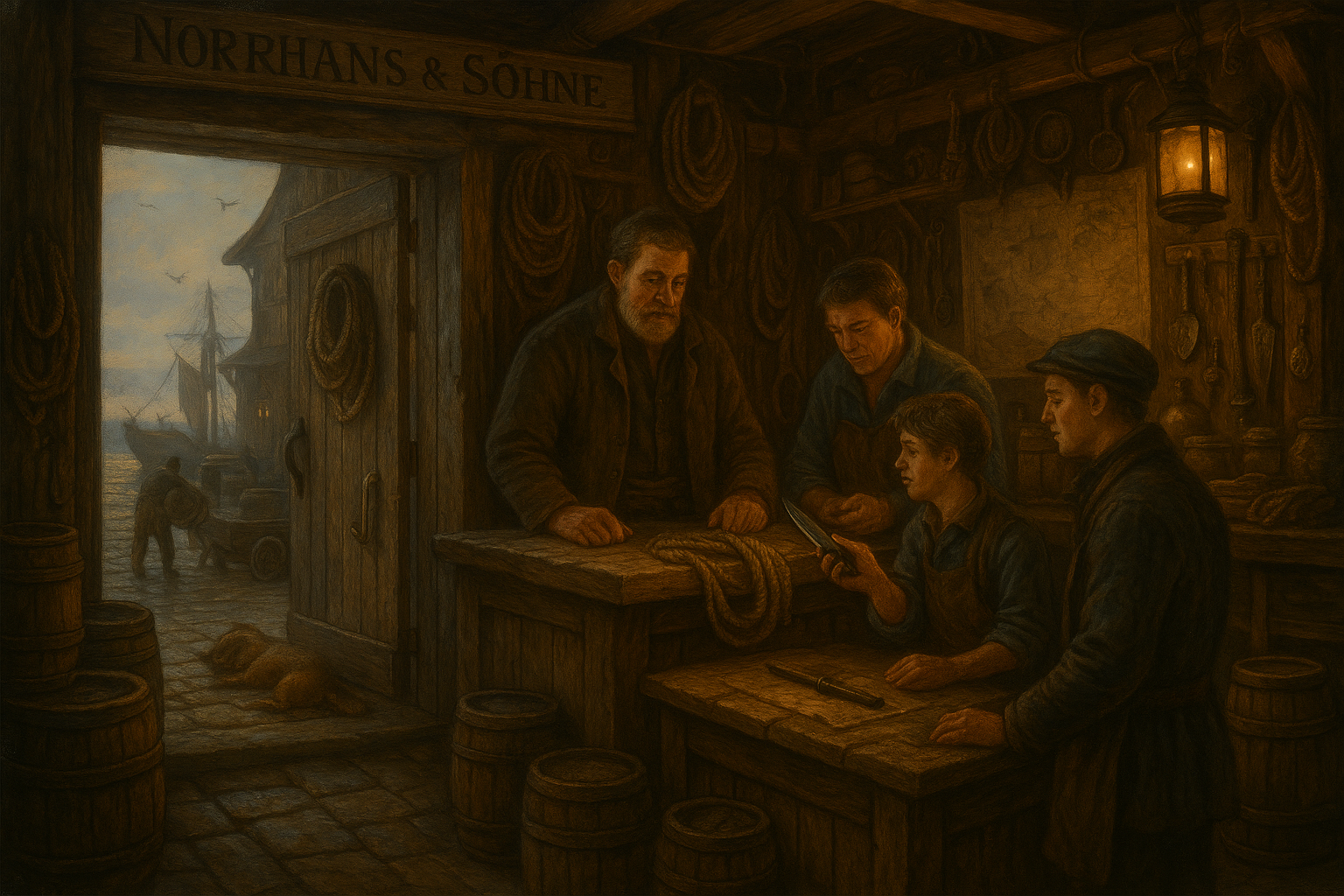 Ein rustikales, ehrliches Geschäft nahe dem Hauptkai, das alles bietet, was ein Seemann für die Reise braucht. Die Familie Norrhan führt den Laden seit Generationen und ist für ihre Zuverlässigkeit ebenso bekannt wie für ihre trockene, humorvolle Art. Zwischen Fässern, Taurollen und Werkzeugen riecht es nach Teer, Salz und Hanfseil – ein vertrauter Duft, der jedem Seemann Heimat bedeutet.