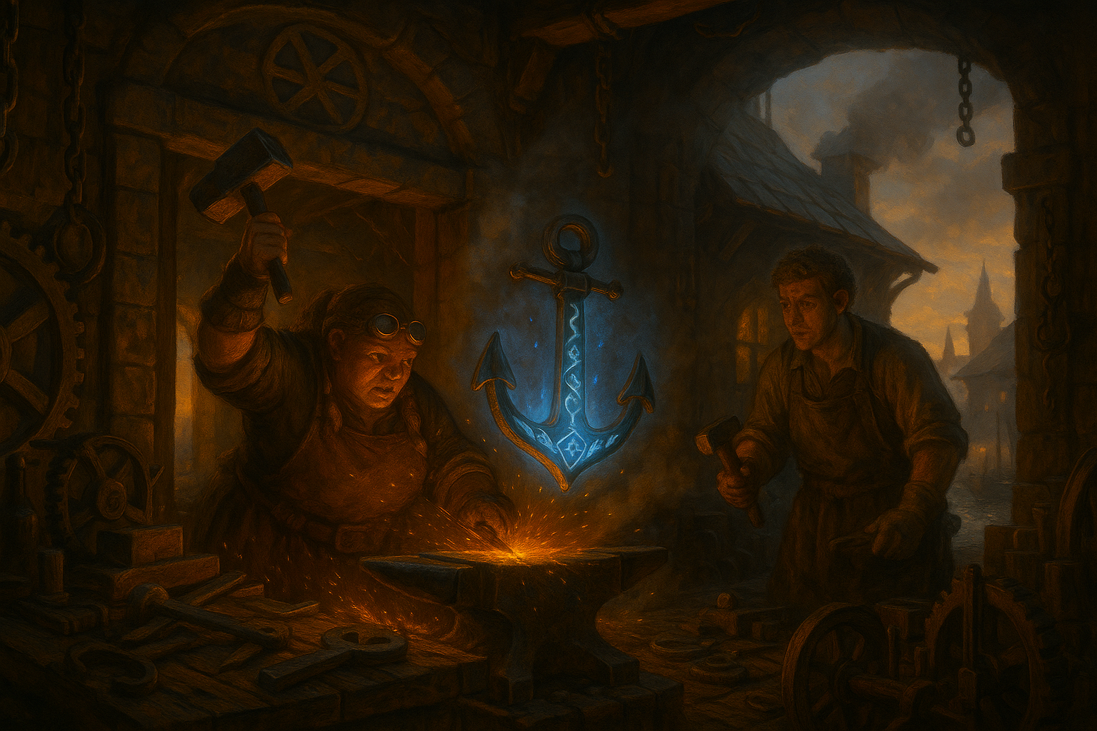 Eine Werkstatt, in der Runenschmiede magische Segel, Anker und Schiffskomponenten herstellen. Das rhythmische Hämmern hallt Tag und Nacht durch die Gassen, begleitet vom Summen schwebender Werkzeuge.