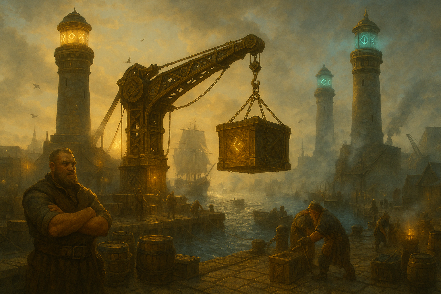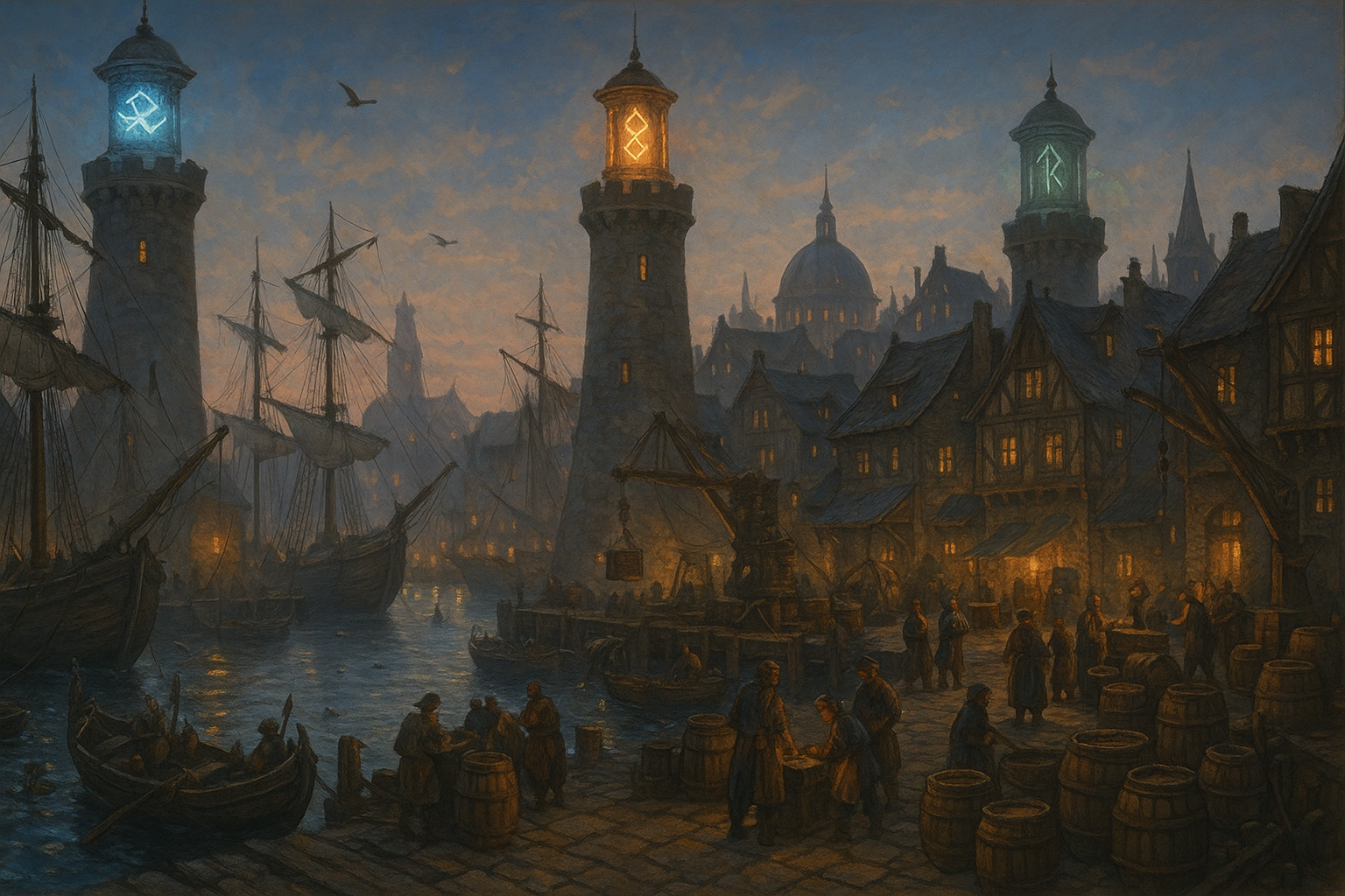 Das gewaltige Hafenbecken wird von drei magisch verstärkten Leuchttürmen eingerahmt, deren Kristalllinsen in wechselnden Farben leuchten und Schiffe sicher durch Nebel und Nacht führen. Über die Kais rollen Karren, Kräne aus Bronze bewegen sich wie von selbst, und der Geruch von Salz, Öl und Algen erfüllt die Luft.