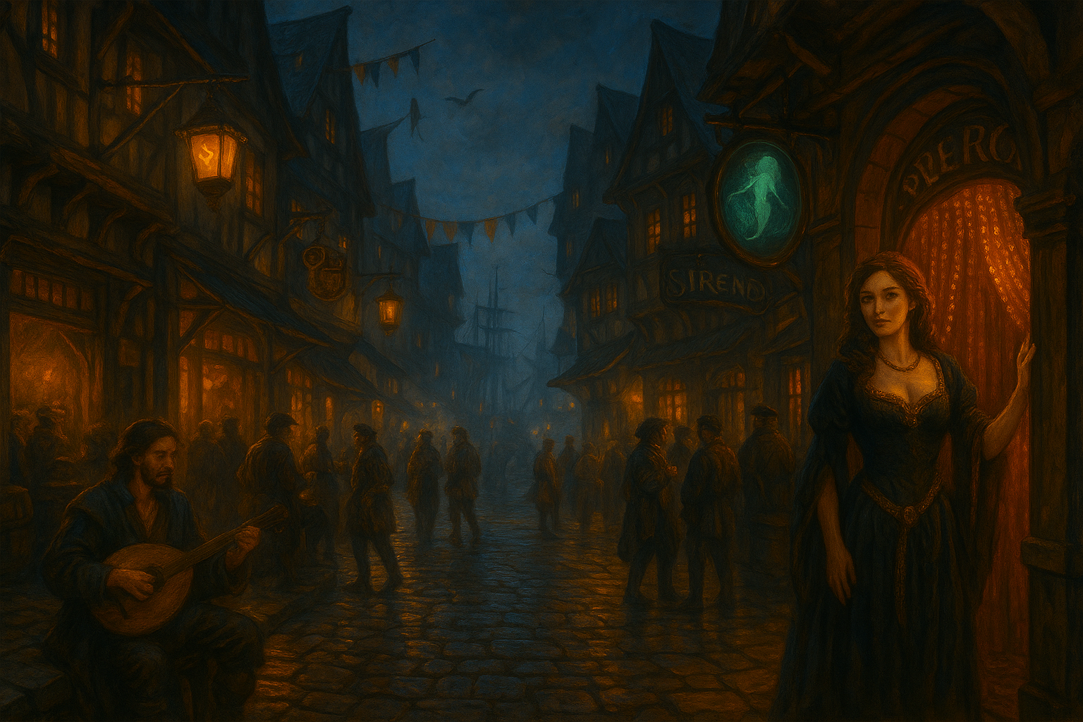 Das pulsierende Herz des Nordhavener Nachtlebens liegt entlang der goldglänzenden Uferstraße, deren Laternen das Pflaster in warmes Licht tauchen. Hier reihen sich Tavernen, Spielhäuser und zwielichtige Etablissements dicht aneinander. Zwischen Musik, Gelächter und dem Klirren von Würfeln verschwimmen Tag und Nacht – ein Ort des Vergnügens, aber auch des Risikos. Zu den bekanntesten Häusern gehören das wandelbare Perlenfass, die skurrile Werkstatt Der Kupferzahn und die verführerische Sirenenflut, deren Wasser heilende wie gefährliche Kräfte besitzen soll.