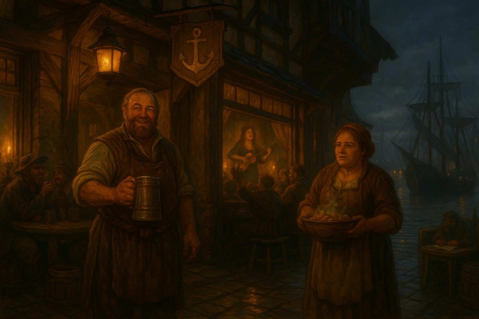 Die beliebteste Schenke des Hafenviertels liegt nur wenige Schritte vom Südkai entfernt und ist Treffpunkt für Seeleute, Händler und Abenteurer gleichermaßen. Hier hallen Lachen, Seemannslieder und das Klirren von Bechern durch die holzgetäfelte Stube, während draußen das Meer gegen die Kaipfähle schlägt.