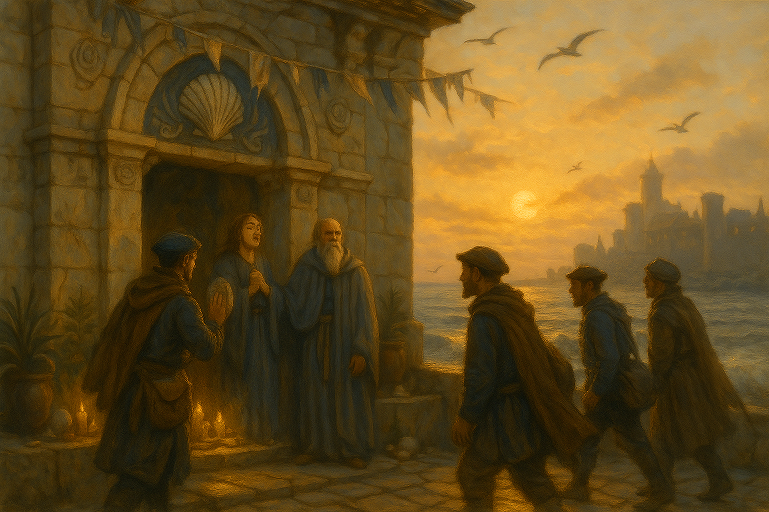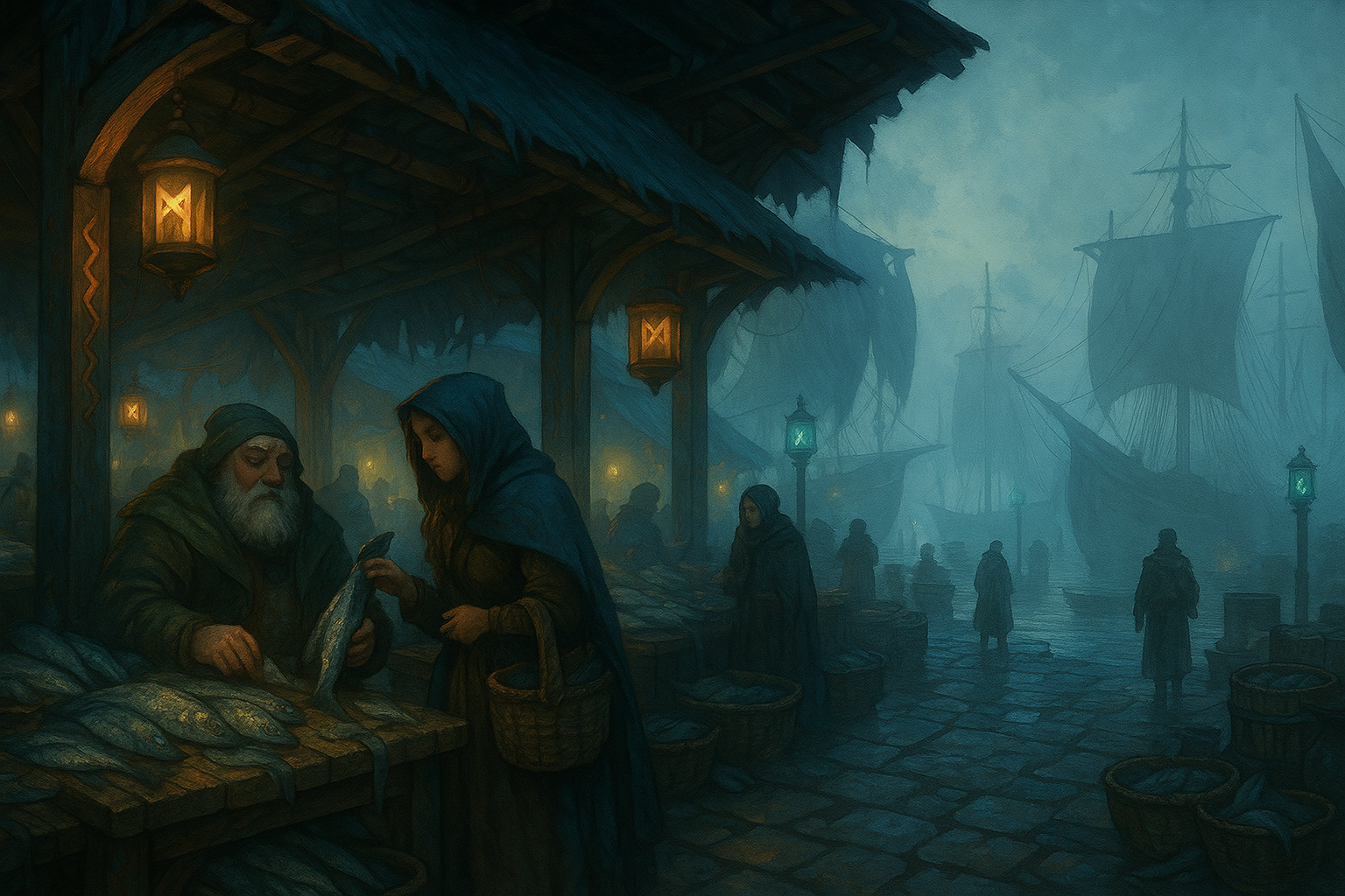 Ein überdachter Markt nahe der westlichen Docks, berühmt für frischen Fisch, Salz, Algenprodukte und magische Tinkturen. Morgens liegt Nebel zwischen den Ständen, durchzogen von Runenlichtern und dem Duft gebratener Seevögel.