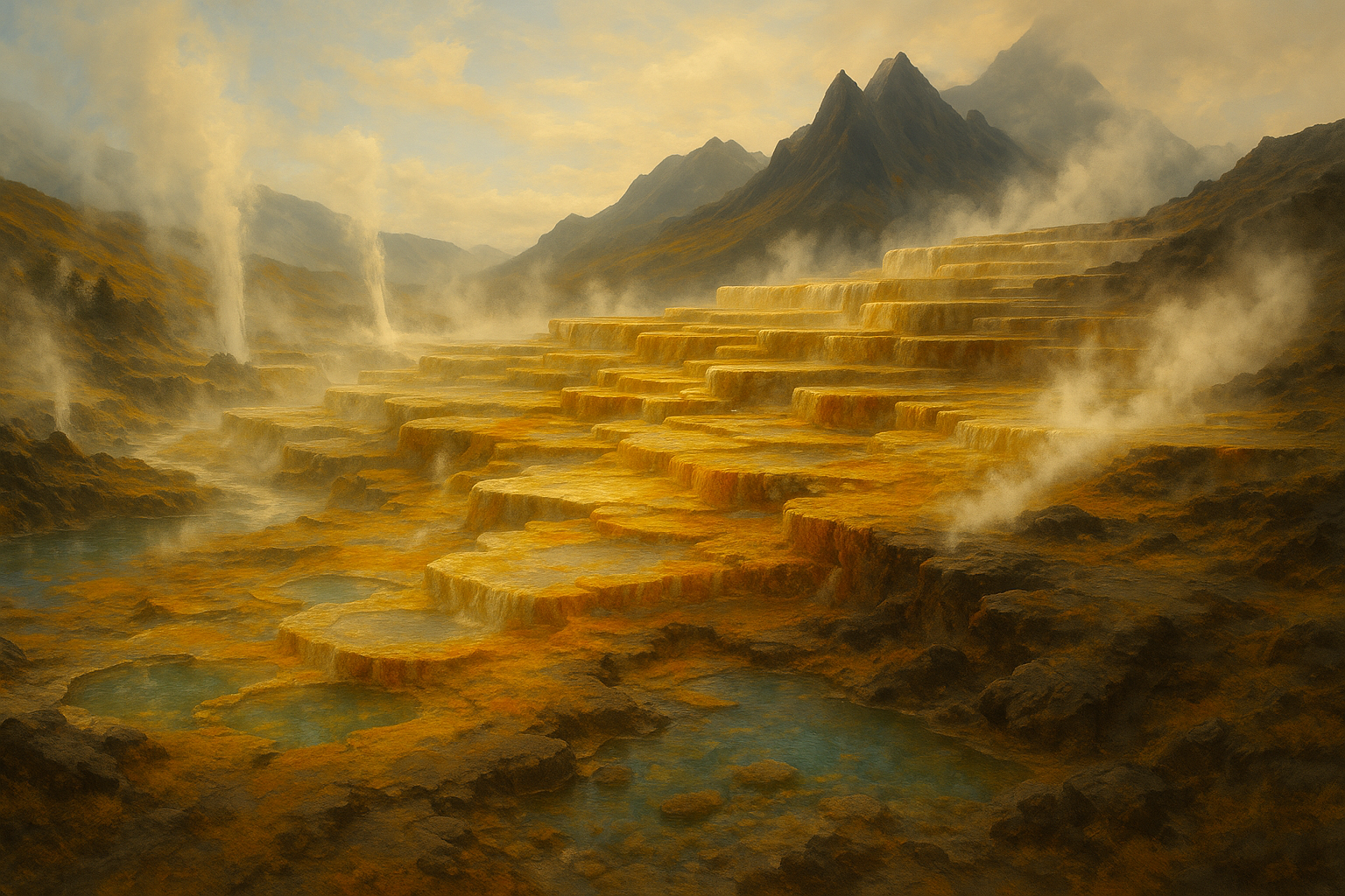 Zwischen den Stufen sammeln sich Becken, warm und klar, mit Rändern aus leuchtendem Mineral. Das Wasser ist heiß genug, um Haut zu röten, aber mild genug, dass sich Leben darin hält – seltsame Pflanzen mit wachsartiger Haut und kleine, durchscheinende Fische, die in den dampfenden Rinnen gleiten. Der Geruch ist eine Mischung aus Schwefel, Salz und Moos – das Parfum eines Landes, das gleichzeitig stirbt und geboren wird. Über den Becken steigt Dampf auf, der sich mit feinem Staub mischt und das Licht in weiche, goldene Schleier taucht. In den frühen Morgenstunden schimmern die Stufen in irisierenden Farben, als würde das Land selbst das erste Licht trinken.