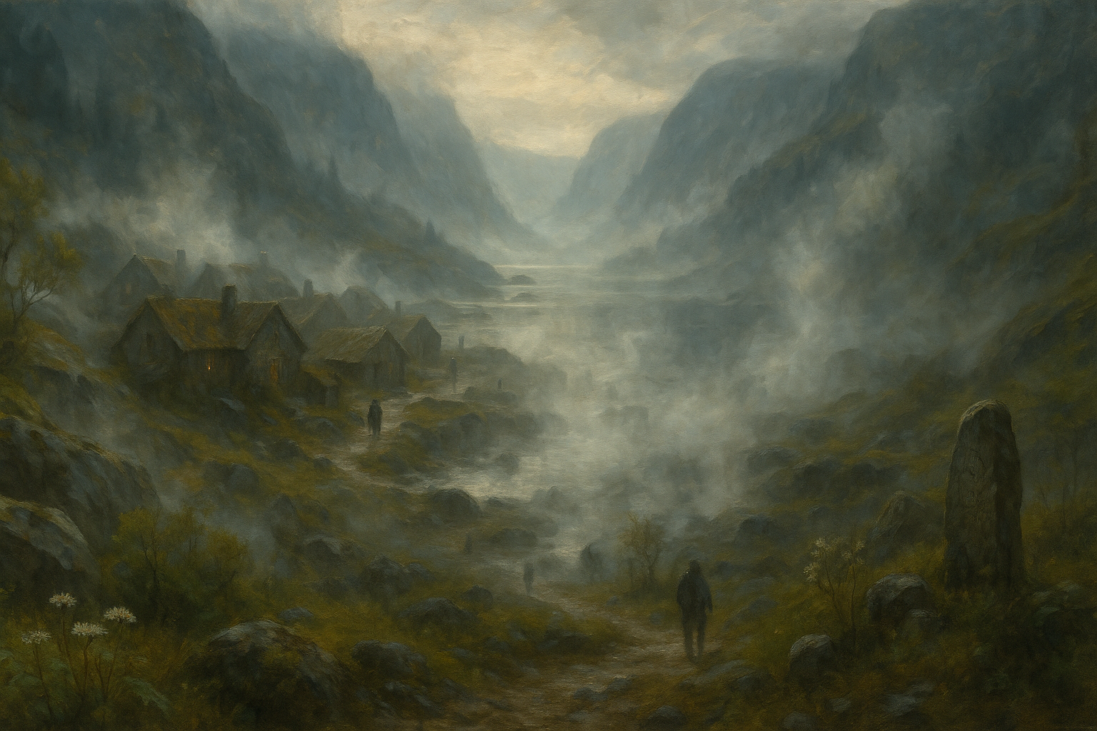 Im hohen Norden des Fjordlands liegt Helyr, ein Ort, der in alten Liedern als „die atmende Schwelle“ besungen wird – ein Land aus Nebel, Stein und Schweigen.