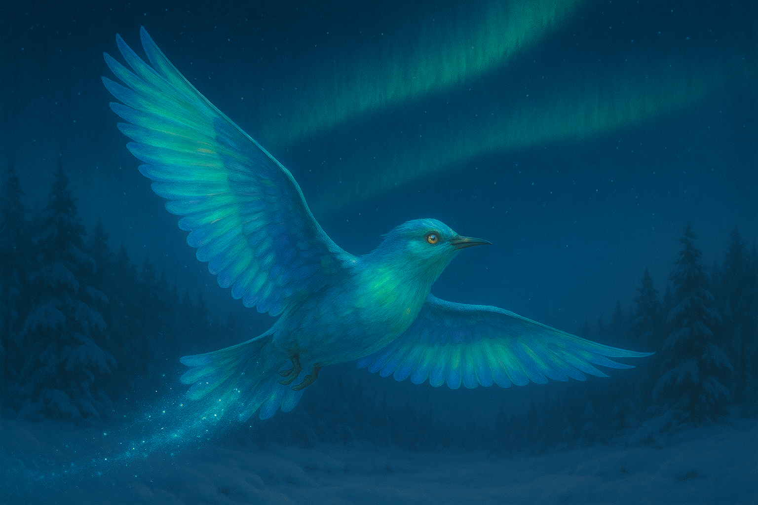 Sein Gefieder schimmert in unzähligen Blautönen, als trüge es das Licht der Polarnacht selbst. Jede seiner Bewegungen ist weich und lautlos, ein kaum wahrnehmbarer Atemzug der Kälte. Seine Augen leuchten mattgolden wie gefrorene Sonnen, und im Flug hinterlässt er einen feinen Schweif aus glitzerndem Staub, der im Licht vergeht, bevor er den Boden berührt.