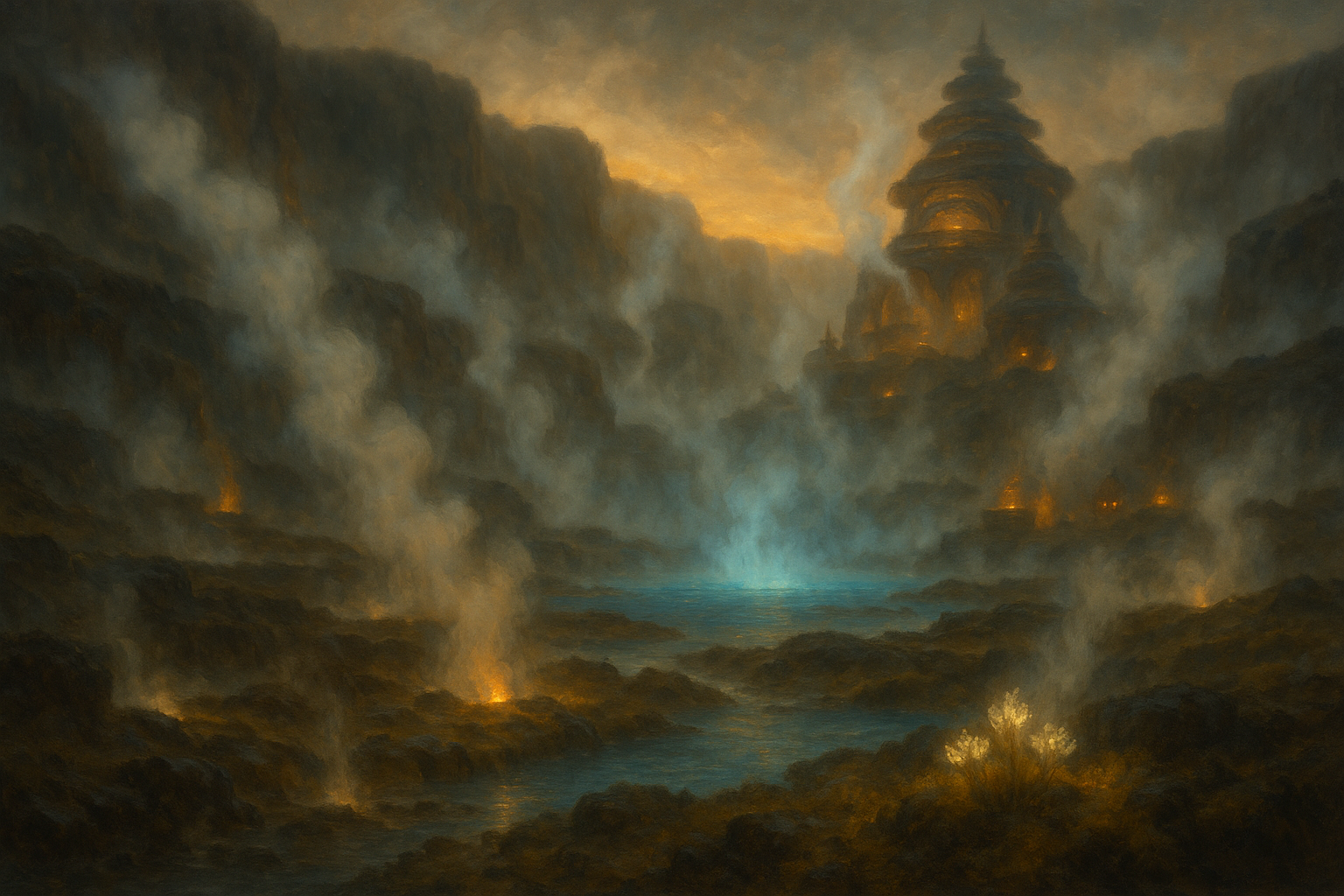 Versteckt im Herzen der Basaltfjorde liegt dieses Tal dort, wo die Erde noch glüht. Für Reisende ist Huldafall ein Ort der Prüfung und Offenbarung – ein Grenzland zwischen Leben und Legende. Wer den Nebel durchquert, spürt die feuchte Wärme auf der Haut, das Brennen des Schwefels in der Kehle und das Pochen der Tiefe unter den Füßen. In der Dämmerung glühen die Schwaden wie Geisterflammen, und über den heißen Seen schweben Lichter, die den Narfjarn als Boten der Tiefe gelten.