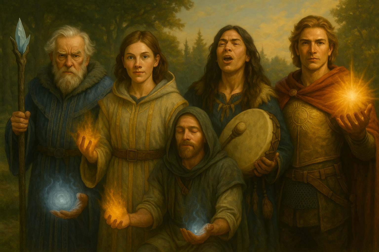 Sie sind jene, die sich zwischen die Welt und den Schmerz stellen, die das Leiden anderer tragen, um das Gleichgewicht zu erhalten. Das Licht der Eldhara, der Klang Saelaris und der Frost Hrimnirs sind für sie keine Waffen, sondern Werkzeuge der Heilung. Mit ruhiger Hand lenken sie das Lebensnetz, flicken zerrissene Fäden und führen gebrochene Seelen zurück in den Strom.