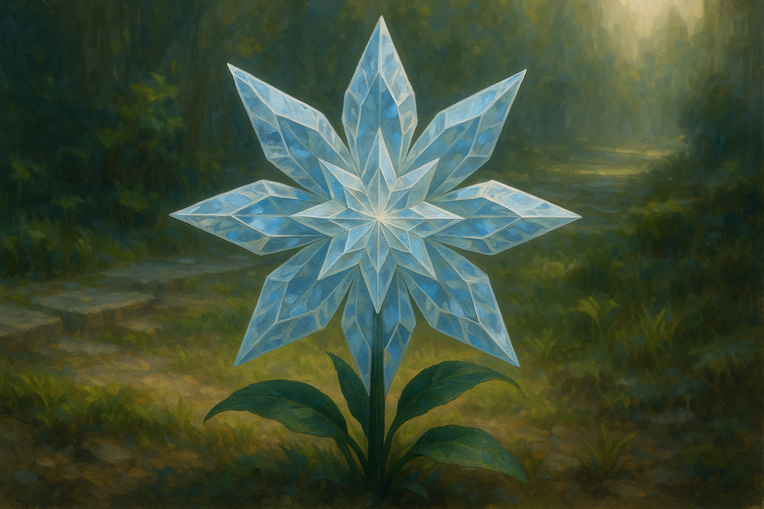 Im kühlen Morgenlicht erwacht die Járnstjarna, und mit ihr scheint selbst die Welt den Atem anzuhalten. Diese seltene, magische Blume entstammt den rechtsschaffenen Ebenen und gilt in der Welt von Njörvalla als göttliches Sinnbild der Harmonie und Beständigkeit. Ihre kristallenen Blütenblätter fangen das Sonnenlicht ein und zerstreuen es in funkelnden Strahlen, die jede Umgebung in sanfte Klarheit tauchen. Das Silberweiß ihrer Blätter schimmert wie gefrorenes Licht, und ihr feiner Duft erinnert an Eisen, das im Tau der Dämmerung ruht. Eine kaum wahrnehmbare, ordnende Aura umgibt sie – sie glättet den Geist, stärkt das Maßvolle und vertreibt die Schatten des Chaos.