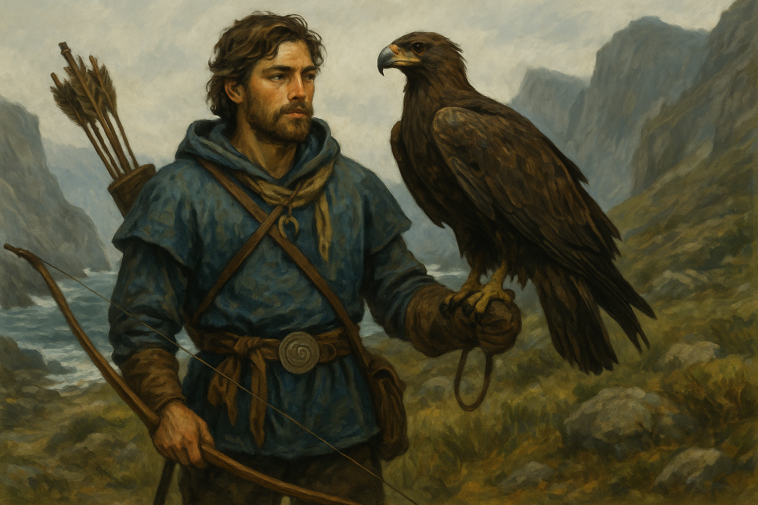 Ein stiller Jäger aus den Klippen der Westküste Njörvallas. Er hört die Zeichen des Windes, liest die Bewegung der Möwen und spricht mit dem Nebel, als sei er ein alter Freund. Sein Seeadler Skara ist sein Auge im Sturm. Kaelan tötet nicht für Ruhm, sondern für das Gleichgewicht – er jagt, um zu nähren, nicht zu zerstören.