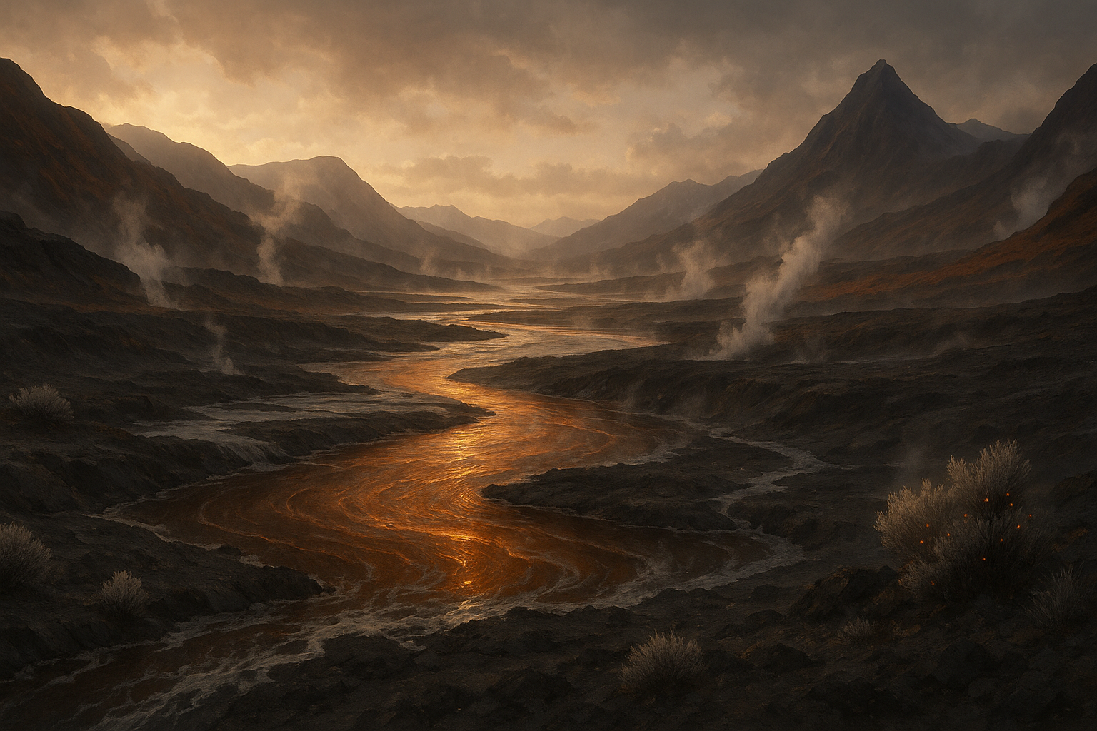 Über die Hänge fließen heiße Flüsse, gespeist von den Quellen der Feuerkronen. Sie schneiden tiefe Furchen in den Fels, dampfen, glühen, singen. Zwischen ihnen liegen weite Flächen aus schwarzem Sand, durchzogen von weißen Kalkadern, die wie Narben glänzen.