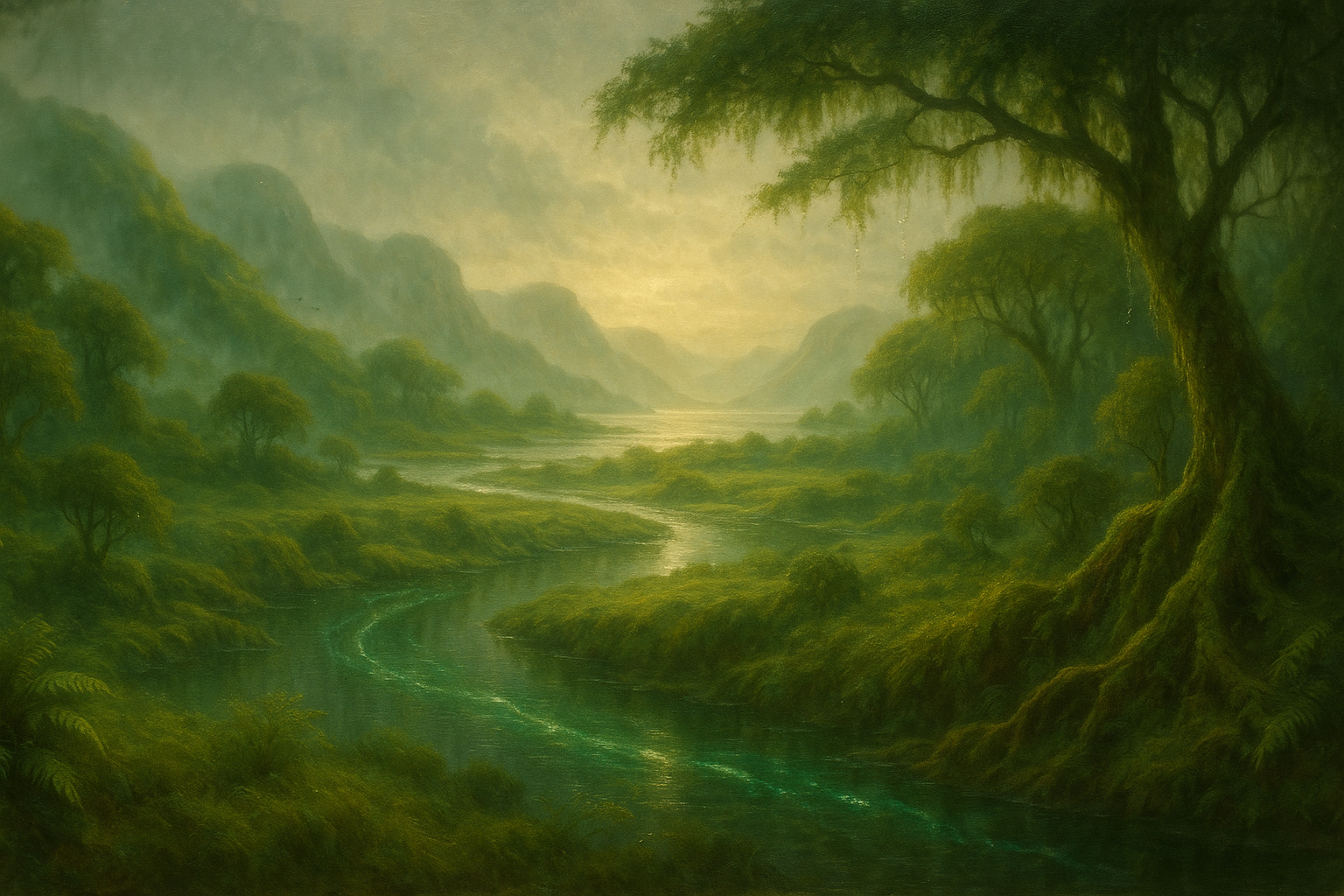 Ein Netz silbriger Wasseradern durchzieht das Land. Die drei Hauptflüsse – Thalven, Morae und Aenlir – entspringen in den Nebelbergen und winden sich südwärts in weit verzweigte Deltas. Ihr Wasser ist klar, nährstoffreich und von sanft leuchtenden Algen durchzogen, die in mondhellen Nächten aufblinken wie Atemzüge der Erde. Die Küsten wechseln zwischen Klippen, Riffen und Marschinseln; Sturmfluten formen Jahr für Jahr neue Ufer, und die Bewohner lesen in den Mustern des Schlicks die Zeichen kommender Winde.