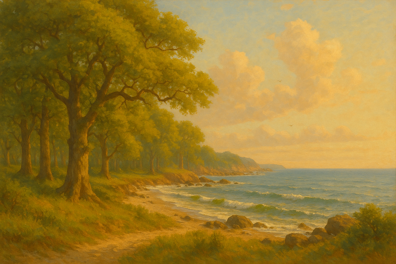 Das Licht verändert sich minütlich: Morgens liegt es bleich auf dem Wasser, mittags glüht es gold zwischen den Ästen, und abends färbt der Sonnenuntergang die Küste in Bronze und Rot. Wenn die Nacht kommt, bleiben nur noch das Rauschen und das leise Pfeifen der Äste – ein beständiger, ruhiger Klang, wie der Atem des Waldes selbst.