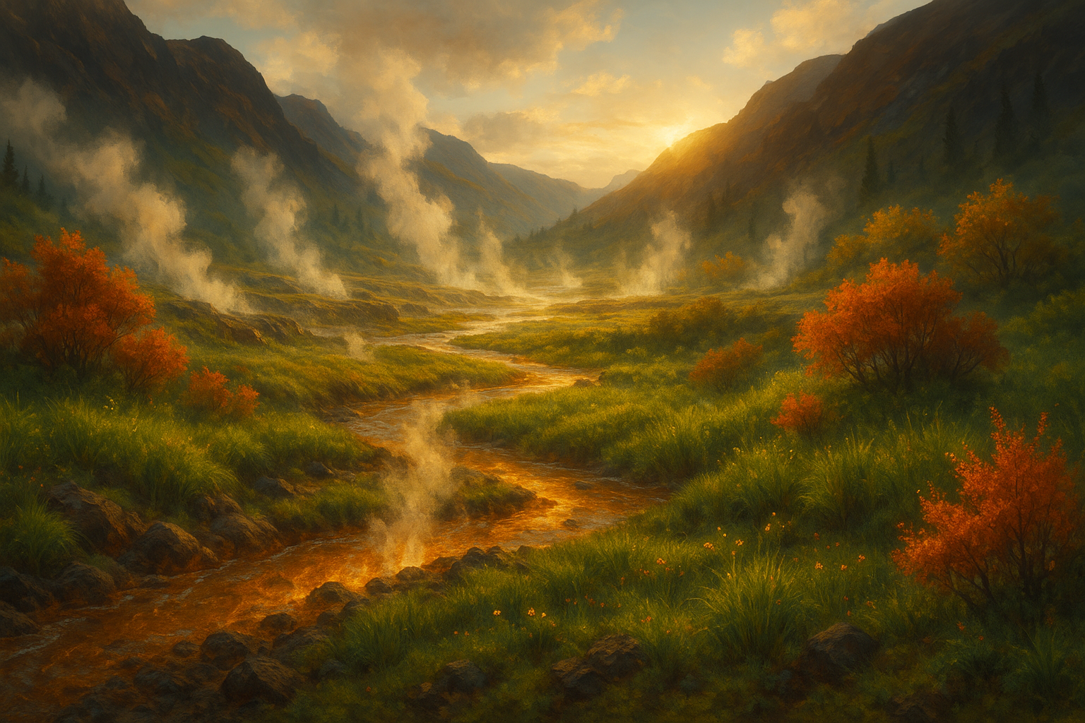 Wenn die Sonne sinkt, verwandelt sich das Tal in ein Meer aus Glanz. Der Dampf steigt in langen Schleiern auf, färbt den Himmel bernsteinfarben und taucht alles in Wärme. Dann riecht die Luft nach Regen, obwohl keiner fällt, und für einen Moment glaubt man, das Feuer habe wirklich gelernt, zu träumen. Lóvengard gehört zu den südlichen Ausläufern der Feuerkronenberge und bildet den natürlichen Übergang zwischen den vulkanischen Höhen und den gemäßigteren Landschaften weiter südlich. Geologisch und klimatisch ist es Teil des sogenannten Atems der Erde, der sich von Geysvidda bis in die Täler zieht – die Zone, in der Glut zu Leben wird. In den Mythen der Feuerkronen heißt es, Lóvengard sei der Ort, an dem das erste Feuer seinen Zorn verlor, als es die Erde berührte, und dass seither jedes Flammenlicht einen Hauch seiner Erinnerung trägt.