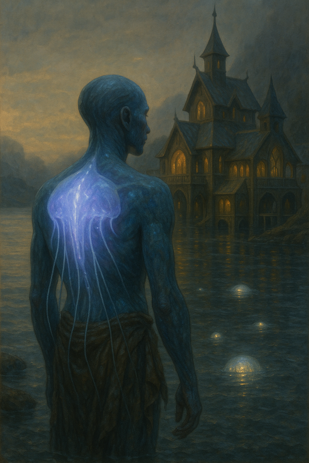 Mit den Jahren wächst die Sólmeda zu einem lebendigen Organ heran, halb außen, halb innen, sichtbar als gläserne Struktur auf dem Rücken. Ihre pulsierende Glocke ruht zwischen den Schulterblättern, ihre Tentakel verlaufen wie leuchtende Adern entlang der Wirbelsäule. Im Rhythmus des Atems fließt Licht durch diese Linien – sichtbar als sanftes, blauviolettes Glühen.