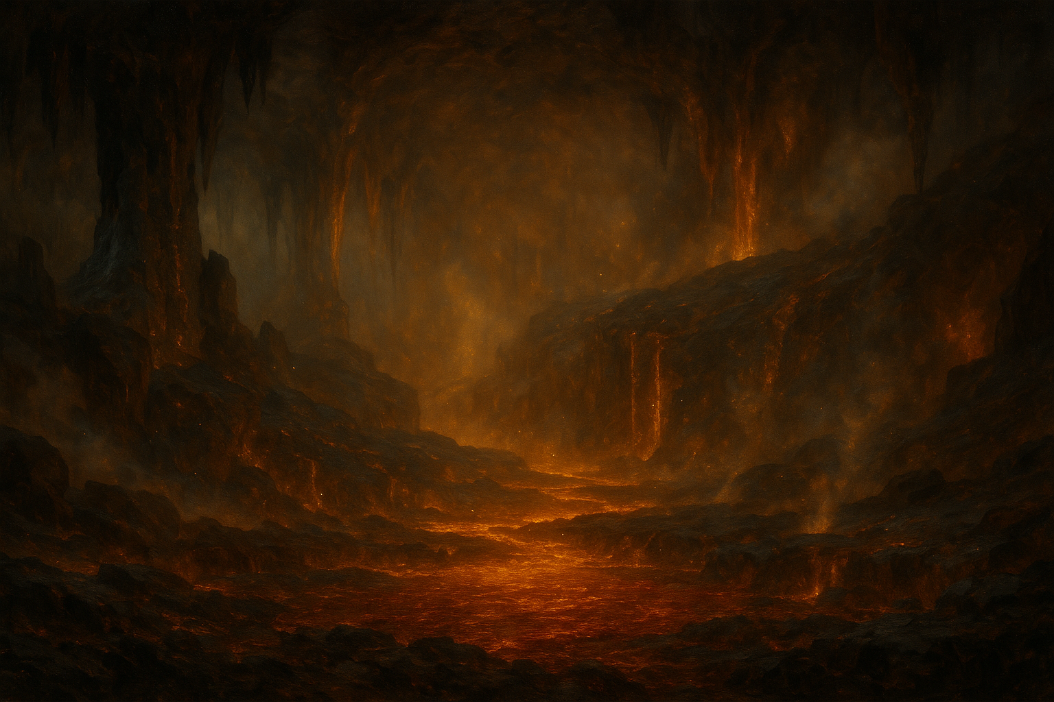 Die Höhlen reichen weit – verzweigt, unberechenbar und voller Labyrinthe, die tagelang keinen Ausgang gewähren. Manche Hallen tragen Kristalle, die in der Hitze wachsen und beim Knistern des Magmas singen, während in anderen Lavakaskaden aus der Decke stürzen, auf halbem Weg erstarren und schwarze Vorhänge bilden, deren starre Flächen im Beben der Tiefe klingen wie uralte Steinorgeln. Zwischen diesen gewaltigen Kammern winden sich enge Gänge, in denen das Licht der Runenadern flackert und die Hitze den Atem raubt. Der Übergang von einer Höhle zur nächsten gleicht einer Reise durch die Schichten eines atmenden, flüssigen Berges, und jede Kammer offenbart eine neue Form des Feuers, eine neue Stimme des Gesteins.
