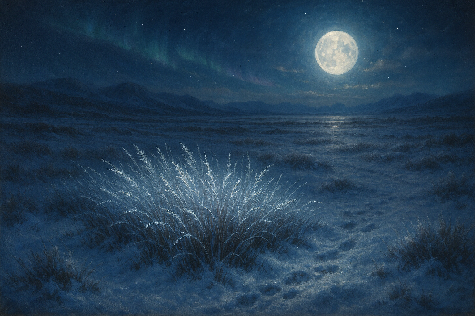 Das Mondlicht-Gras hat eine silbrig-grüne Farbe und schimmert besonders im Mondschein, wodurch es aussieht, als ob die Halme von kleinen Lichtpunkten überzogen wären. Dieser sanfte Schimmer gibt der Pflanze ihren Namen und ist ein beeindruckender Anblick, der die Tuath'vayra seit Generationen inspiriert. Es wächst in dichten, niedrigen Büscheln, die wie kleine Lichtteppiche wirken und die dunkle Landschaft der frostigen Tundra aufhellen. Die Halme sind dünn, glatt und geschmeidig, sodass sie selbst unter einer Schneeschicht weiter wachsen können. Das Mondlicht-Gras ist bemerkenswert widerstandsfähig. Es zieht Nährstoffe aus den kargen Böden der Tundra und überlebt Temperaturen, die für andere Pflanzen tödlich wären. Sein langsamer, stetiger Wuchs sorgt dafür, dass es eine beständige Quelle für die Rentiere ist.
