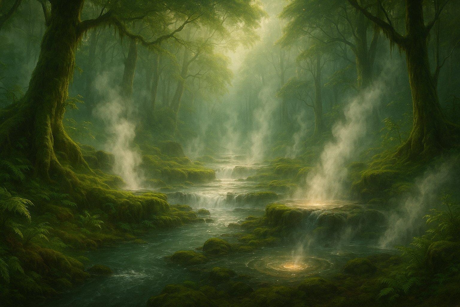 Im Osten von Geysvidda, dort, wo das Land sich senkt und die heißen Quellen in Becken und Flüsse übergehen, beginnt Mýrrskog – der Wald des Dampfes. Eingebettet in das weite Geflecht der Feuerkronenberge, liegt er wie ein lebendiges Herz inmitten von Stein und Glut. Es ist ein Ort, an dem Feuer und Leben sich versöhnen. Die Luft ist feucht und schwer, durchzogen von Wärme und süßem Harz. Hier dampft alles: Erde, Blätter, Wasser, selbst das Licht. Von den Höhen der Berge fließt heißes Wasser in schmalen Bächen herab, gespeist aus uralten Quellen, die tief in der Erde von flüssigem Gestein genährt werden. Es sammelt sich in moosigen Mulden, in klaren Seen und überfluteten Lichtungen, wo Blasen leise aufsteigen und in Nebel zerfallen.