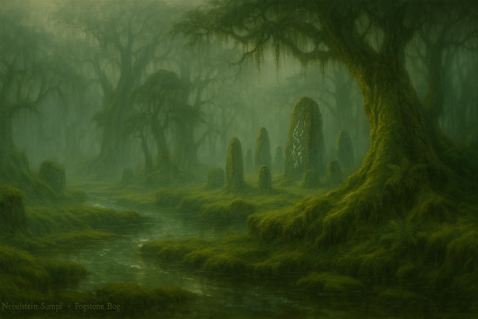 Urzeitliche Steinkreise, durchzogen von tief eingeschnittenen Runen und von der Zeit gezeichnet, erheben sich zwischen dicht gedrängten Baumriesen. Diese knorrigen, jahrhundertealten Bäume tragen dicke Schichten aus Moos und Farnen, ihre Äste verheddern sich zu einem übernatürlichen Baldachin, der das spärliche Licht nur in flüchtigen, schimmernden Strahlen durchlässt. Der Nebel, der stetig über dem Sumpf liegt, dämpft die Welt zu einem gedämpften Farbenspiel aus Grautönen und sattem Grün, während er den Blick auf die Geheimnisse im Dickicht verschleiert.