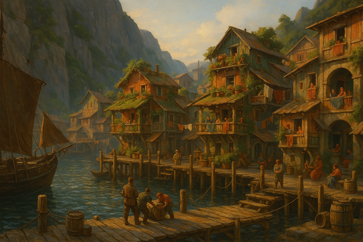 Obwohl die Stadt befestigt ist, bleibt ihre Verbindung zum Meer ungebrochen. Schiffe können direkt an den Docks von Njördskara anlegen, ihre Planken fast eine Verlängerung der Straßen. Wer hier lebt, weiß: Das Meer ist keine Grenze, sondern der Ursprung von allem, was die Stadt ausmacht.