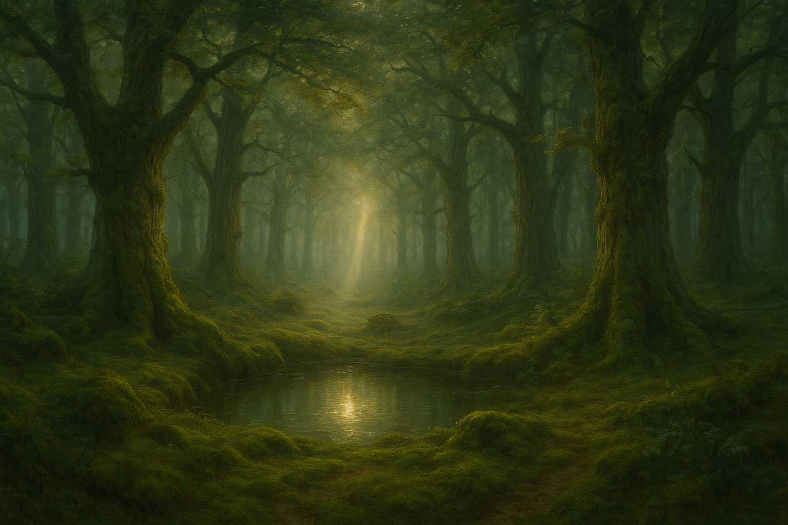 Nordholt ist das dunkle Herz von Eikenholt – ein stiller, uralter Binnenwald, in dem die Zeit langsamer vergeht. Dichte Eichenreihen werfen ein beständiges Dämmerlicht auf den Boden, und zwischen den Stämmen hängt der feuchte Duft von Erde, Moos und Laub. Die Luft ist kühl und schwer, gesättigt von der Feuchtigkeit vergangener Regenfälle, und jeder Schritt auf dem weichen Boden klingt wie ein fernes Echo.