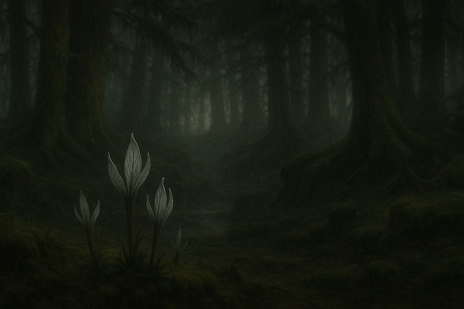 Unter den schweren Kronen der uralten Eiben, verborgen in den tiefen Schatten der Dämmerlande, wachsen die Schattenfinger – eine Pflanze, die das Licht meidet und nur in völliger Dunkelheit ihre wahre Gestalt enthüllt. Ihre langen, schmalen Blütenblätter ragen aus dem dunklen Waldboden wie geisterhafte Finger, mit silbernen Adern durchzogen, die im Zwielicht der Nacht schwach pulsieren. Kein Wind vermag sie zu bewegen, keine Hand wagt es, sie zu pflücken, denn es heißt, dass ihre Anwesenheit kein bloßes Naturphänomen ist, sondern eine Botschaft aus einer verborgenen Welt. Wer in der Stille der Nacht auf sie trifft, spürt für einen Moment eine unbestimmte Präsenz, als ob die Dunkelheit selbst flüstert – ein Echo aus Zeiten, die niemand mehr erinnert. Sie gedeihen nur dort, wo die Schatten tief genug sind, um eine eigene Sprache zu sprechen, in den unberührten Winkeln des Waldes, wo das Licht niemals ganz die Erde erreicht. Ihre Blüten sind nicht für eilige Schritte bestimmt, sondern für jene, die innehalten und die Stille lesen können.