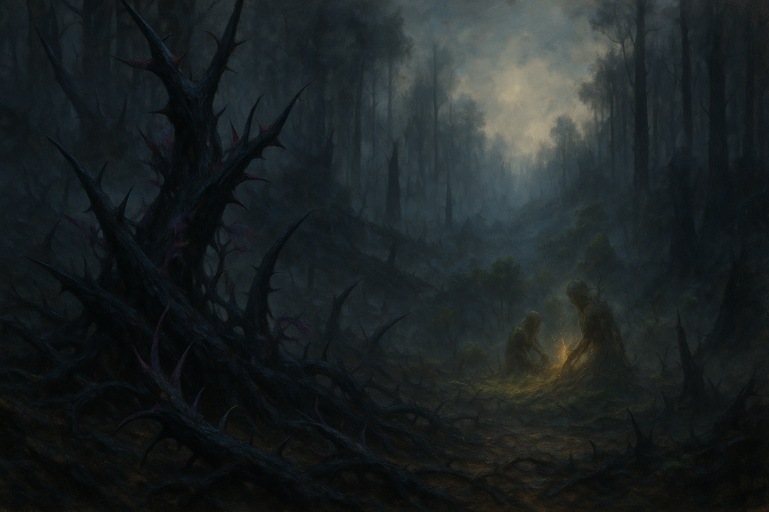 Die Schwarzdornen waren eine invasive Pflanzenrasse, die sich nicht harmonisch mit dem Land verband, sondern es dominierte und erstickte. Ihr Wachstum war aggressiv und unkontrolliert – ihre Wurzeln breiteten sich aus, verdrängten andere Pflanzen und hinterließen tote, lichtlose Gebiete. Sie betrachteten das Wurzelvolk als Konkurrenten und versuchten, ihre Stätten zu vereinnahmen. Ihr Einfluss breitete sich wie ein dunkler Fluch aus, sodass das Wurzelvolk gezwungen war, Grenzen zu ziehen und ihre Gebiete durch Schutzpflanzen zu sichern. In manchen alten Erzählungen ist die Rede von verzweifelten Kämpfen, in denen das Wurzelvolk versuchte, ihre Energie durch magische Wurzelgesänge zu bündeln, um das Wachstum der Schwarzdornen zu bremsen.