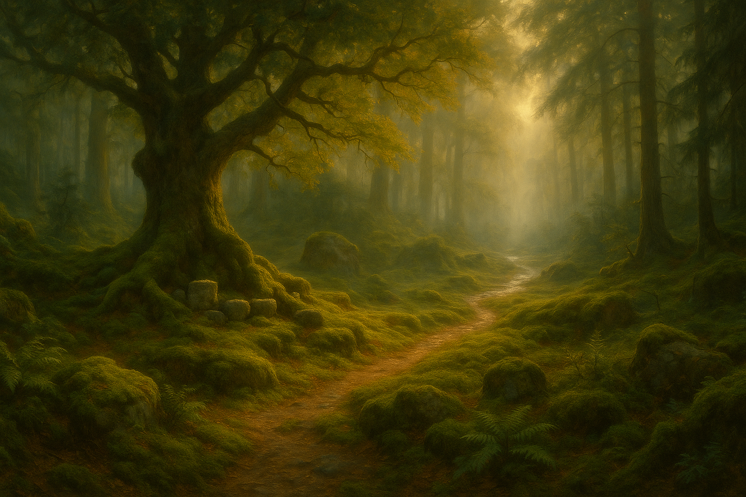 Skogarholm liegt zwischen dem nördlichen Fluss Jorströmm und den steinernen Höhenzügen von den Ausläufern der Donnberge, seine dunklen Wälder eingebettet in eine Welt aus Nebel und Schatten. Nach Westen hin trifft der Wald auf die offenen Graslandschaften von Jorsängar, wo sich die Baumgrenze langsam in feuchte Auen auflöst. Die Höhenzüge im Norden stützen die Landschaft wie eine natürliche Mauer, ihre Gipfel oft verdeckt von dichten Wolkenschleiern. Zwischen den massiven Baumriesen schlängeln sich Pfade, die mal sichtbar und mal verschwunden sind – ein Geflecht aus versteckten Wegen, umgeben von moosbedeckten Felsformationen und unterirdischen Wasserläufen, die sich zwischen den Wurzeln hindurchschlängeln.