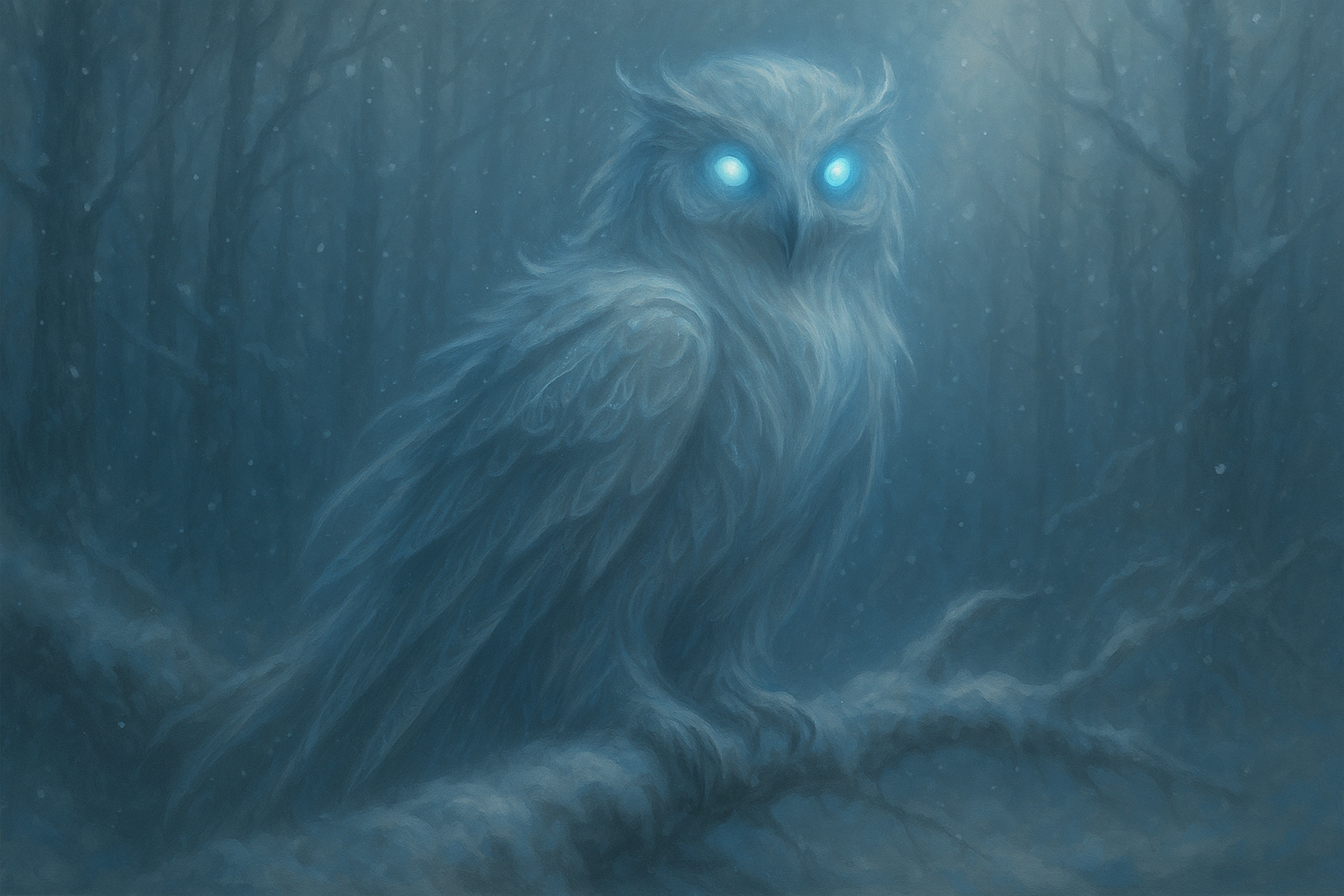 Sie sind unverkennbar Eulen, jedoch weit größer und kraftvoller als jede natürliche Art. Ihr gedrungener, muskulöser Körper ist perfekt an Höhe und Frost angepasst. Das schneeweiße Gefieder trägt feine, schimmernde Muster, die an Eiskristalle erinnern und im Mondlicht soft aufglühen. Mit einer Flügelspannweite von über drei Metern wirken sie im Flug fast schwerelos.