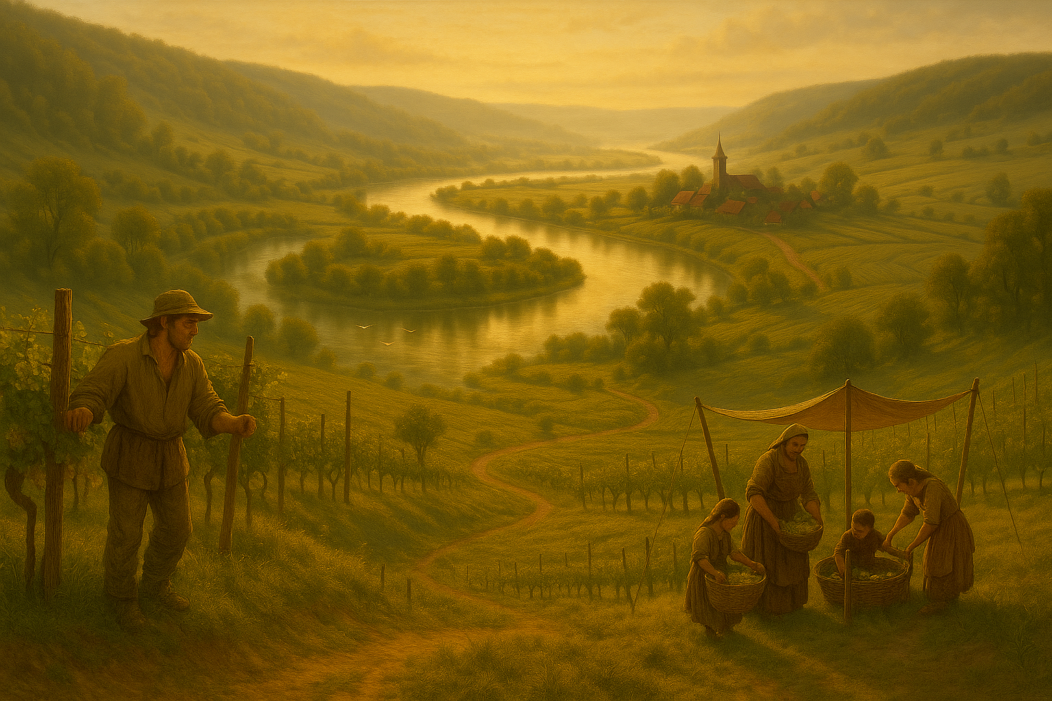 Die Solvik-Schleife ist eine der eindrucksvollsten Landschaftsformationen in Ljósdal, eine gewaltige Biegung des Vindálf, die sich tief ins Land schneidet und eine natürliche Umarmung um die weiten Auen bildet. Hier windet sich der Fluss in einer großen, beinahe kreisförmigen Kurve, bevor er in sein ursprüngliches Bett zurückkehrt. Die Hänge entlang der Schleife steigen sanft an und bieten weite Ausblicke über die schimmernden Wasserflächen, während in den tieferen Bereichen fruchtbare Böden die Grundlage für üppiges Wachstum schaffen. Über Jahrtausende hat der Vindálf hier eine einzigartige, geschützte Landschaft geformt, in der sich Landwirtschaft und Wildnis in harmonischer Weise verbinden. Morgens steigt Nebel aus der Schleife auf und legt sich sanft um die bewaldeten Höhen, während die Sonne die Flusskrümmung langsam in goldenes Licht taucht. Die Siedlungen entlang der Schleife nutzen das ruhige Wasser für Fischerei und Handel, und die Weinreben an den Hanglagen profitieren von den besonderen klimatischen Bedingungen. Die Solvik-Schleife ist nicht nur ein Naturwunder, sondern ein Land, das durch den Fluss geformt wurde und dessen Kreislauf seit jeher den Rhythmus des Lebens bestimmt.