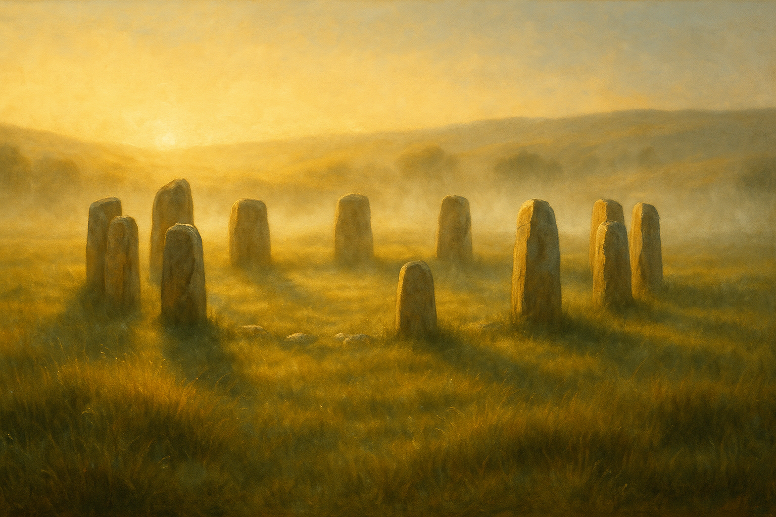 Mitten in den sanften Feldern von Goldmark, dort, wo der Wind kaum je ganz zur Ruhe kommt, erhebt sich der Steinring von Solbrynn. Elf helle Sandsteinblöcke stehen in einem weiten Kreis, ihre Oberflächen glattgeschliffen von Zeit, Regen und ungezählten Sonnenaufgängen. Zwischen den Steinen wächst kurzes, goldgrünes Gras, das im Morgenlicht schimmert, als trüge es den Glanz des Namens in sich.