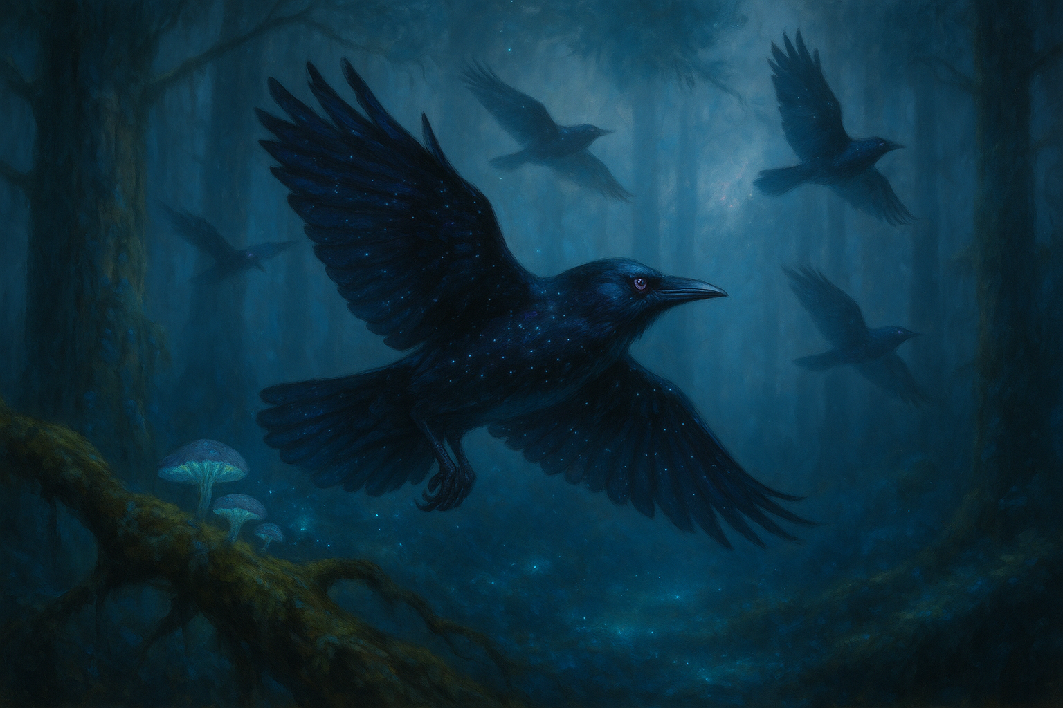 Die Sternschimmerkrähen sind eine der seltensten Vogelarten Njörvallas – bekannt für ihr irisierendes, sternenähnliches Gefieder und ihre Verbindung zu den Flimmerpilzen, jenen leuchtenden Myzelwesen, die das Unterholz von Frideyja und Frostvir durchziehen.