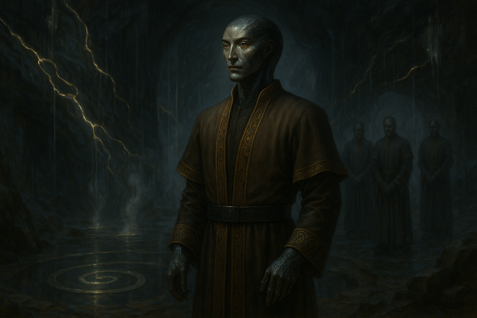Kernidee: Großgewachsene, schlangenartige Humanoide aus schwarzem Glas, geboren im Schweigen zwischen Feuer und Frost; Hüter von Erinnerung, Maß und Erneuerung.