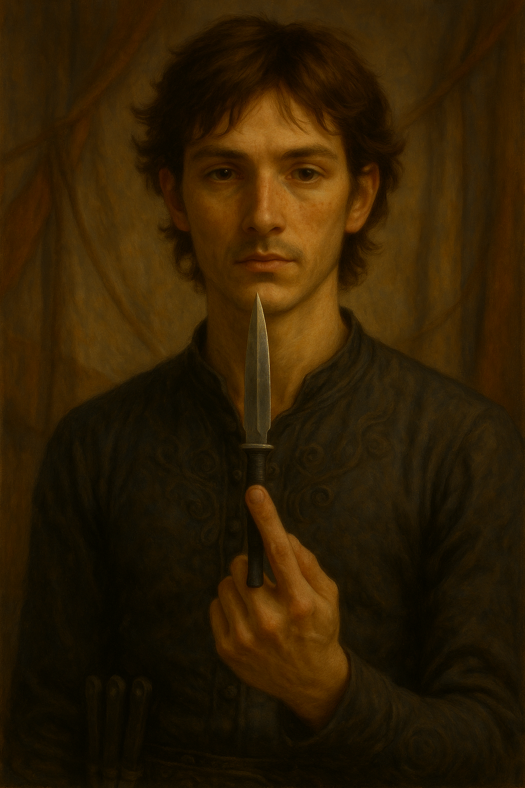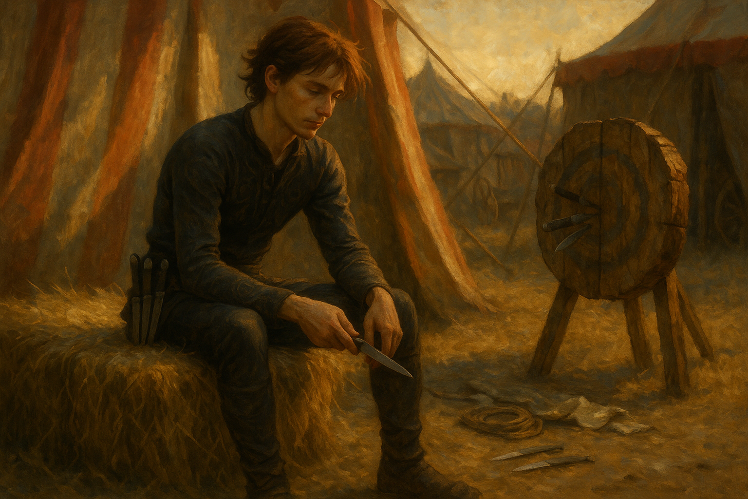 Thule spielte zwischen ihnen, kletterte über Taue, balancierte auf Wagenrädern und lernte früh, was Gleichgewicht bedeutet. Er war ein Kind wie jedes andere – neugierig, laut, staunend –, doch er hatte ein eigenartiges Geschick für Messer. Während andere Stöcke warfen oder Reifen drehten, ließ er Klingen durch die Luft tanzen, als folgten sie einer unsichtbaren Melodie. Er konnte stundenlang üben, ohne zu ermüden, nur begleitet vom dumpfen Schlag, wenn Metall auf Holz traf.