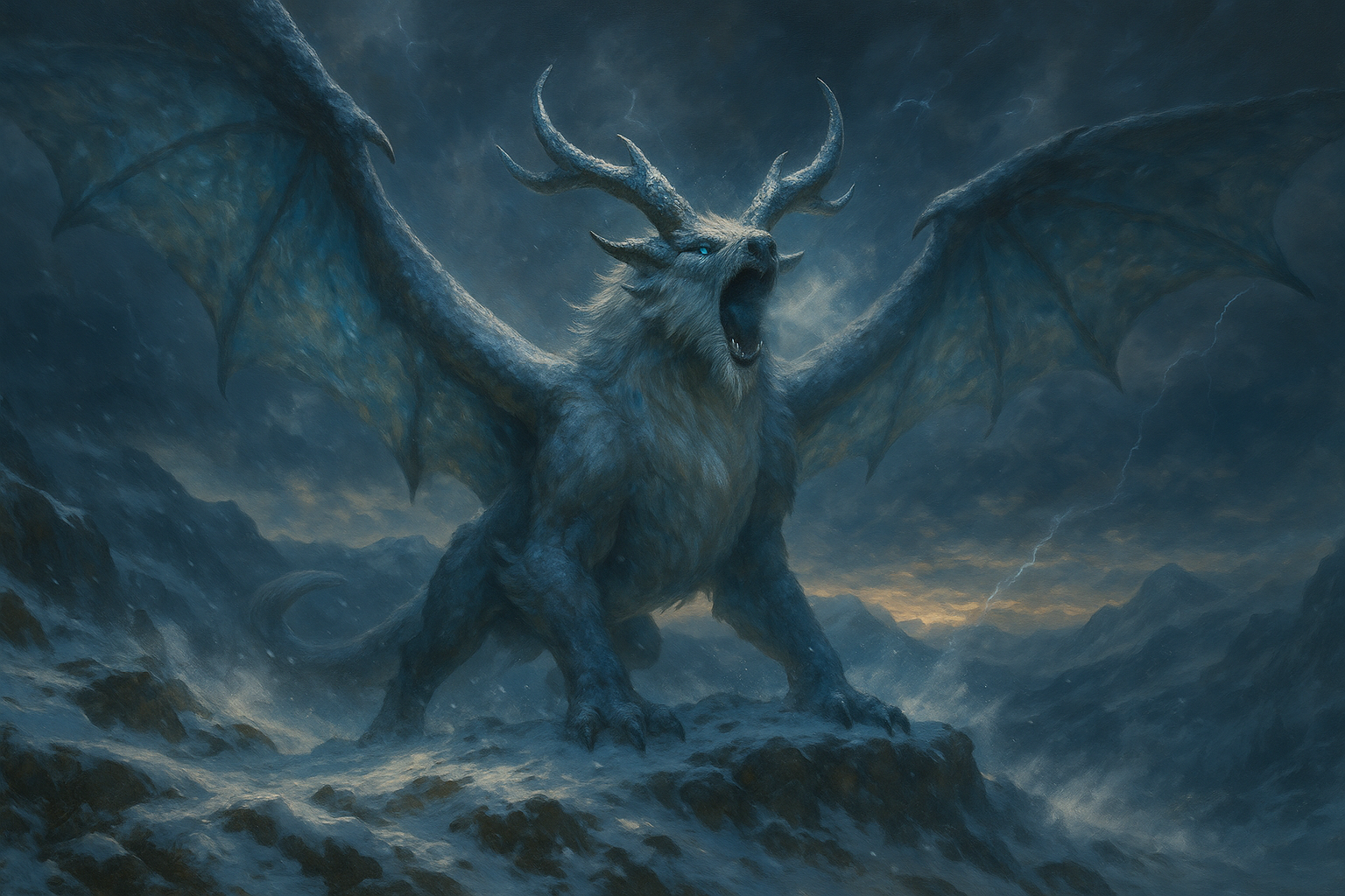 Der Togrodok ist eine imposante Gestalt: ein Mischwesen aus Säugetier und Drache, dessen gewaltige Flügel aus Schuppen und Fell bestehen, durchzogen von Adern aus gefrorenem Licht. Seine Hörner winden sich spiralförmig wie Eisspitzen, und seine Augen leuchten in einem fahlen Blau, das an das Innere eines Gletschers erinnert.