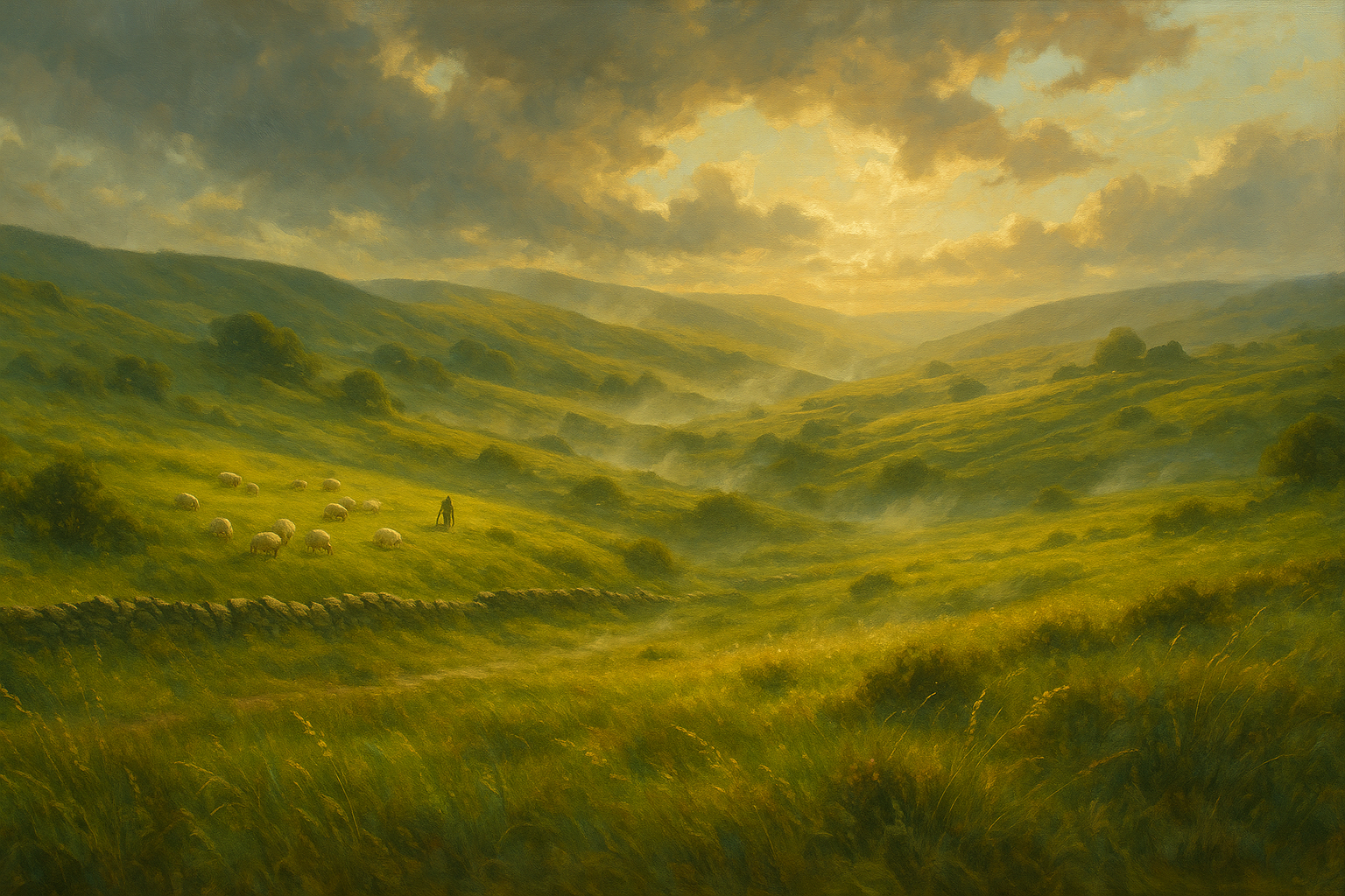Die Landschaft Vildheym ist geprägt von sanft ansteigenden Hügelketten, die sich über weite Ebenen erstrecken und mit Gras, Heidekraut und wilden Kräutern bedeckt sind. Alte Steinmauern, die vor Generationen von Hirten errichtet wurden, durchziehen das Land und markieren die Grenzen zwischen den Weidegebieten. Große Wiesenflächen wechseln sich mit geschützten Senken ab, in denen kleine Wälder gedeihen, die Tieren Zuflucht bieten. Der Wind ist ein allgegenwärtiger Begleiter, der die Bewegung der Landschaft verstärkt und oft für Wetterveränderungen sorgt. Im Westen grenzen die Weiden an die Handelsrouten von Gúlwethar, während die nördlichen Hügel langsam in die frische Küstenlandschaft übergehen. Die schiere Offenheit des Landes macht es zu einem idealen Gebiet für die Viehzucht, da die Tiere genügend Platz haben, um in weiten Kreisen zu ziehen.