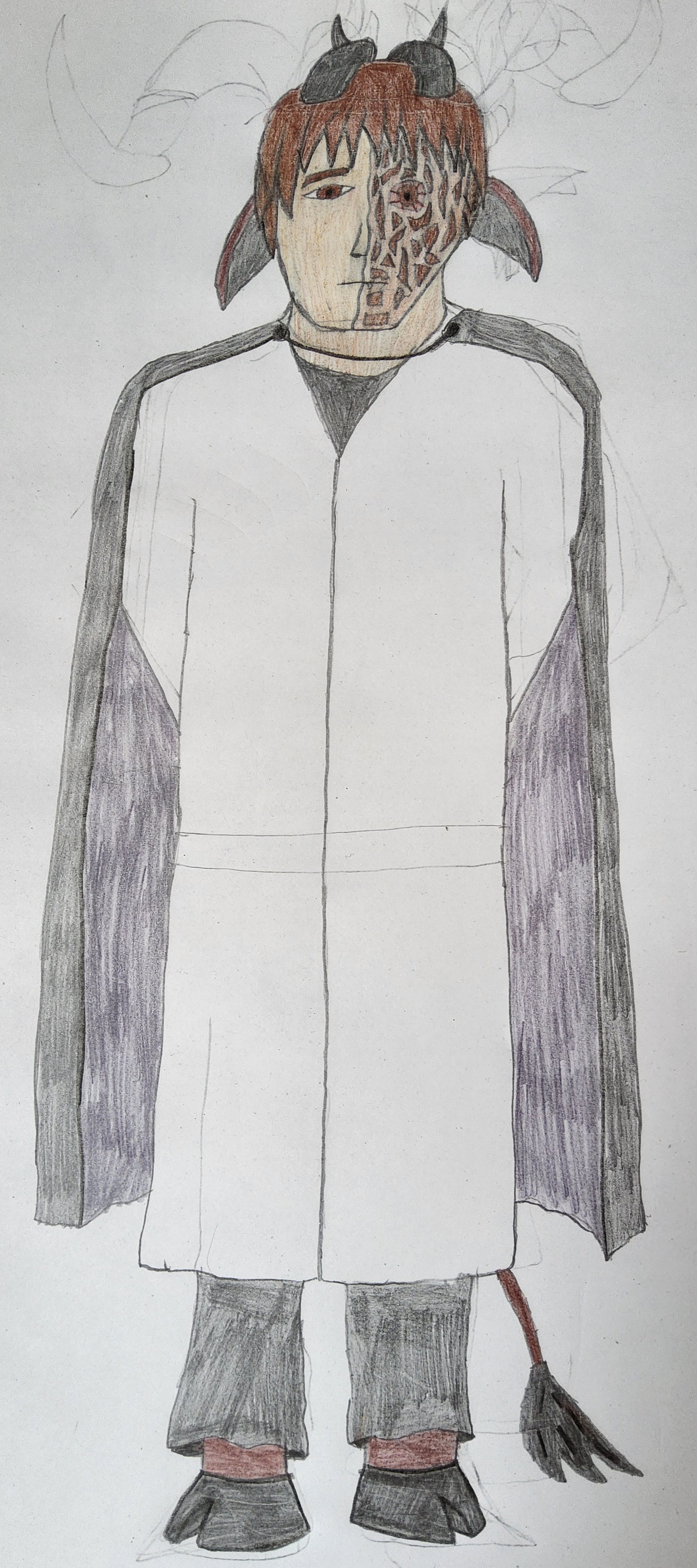 left side of his face his heavily scared, two short backwards curved dark grey horns on the top of his head, a brown bovine tail and two brown bovine ears