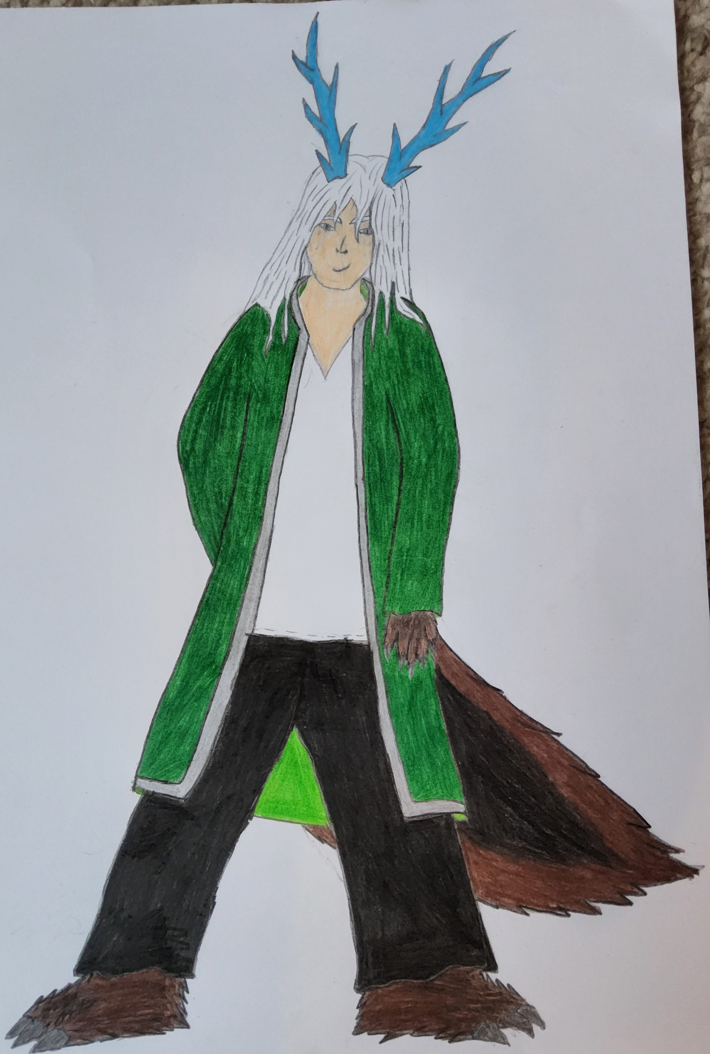 Lucian is a demi human with the form of a humanoid Wolverine of average height and build along with pair of light blue antlers on top of his head.